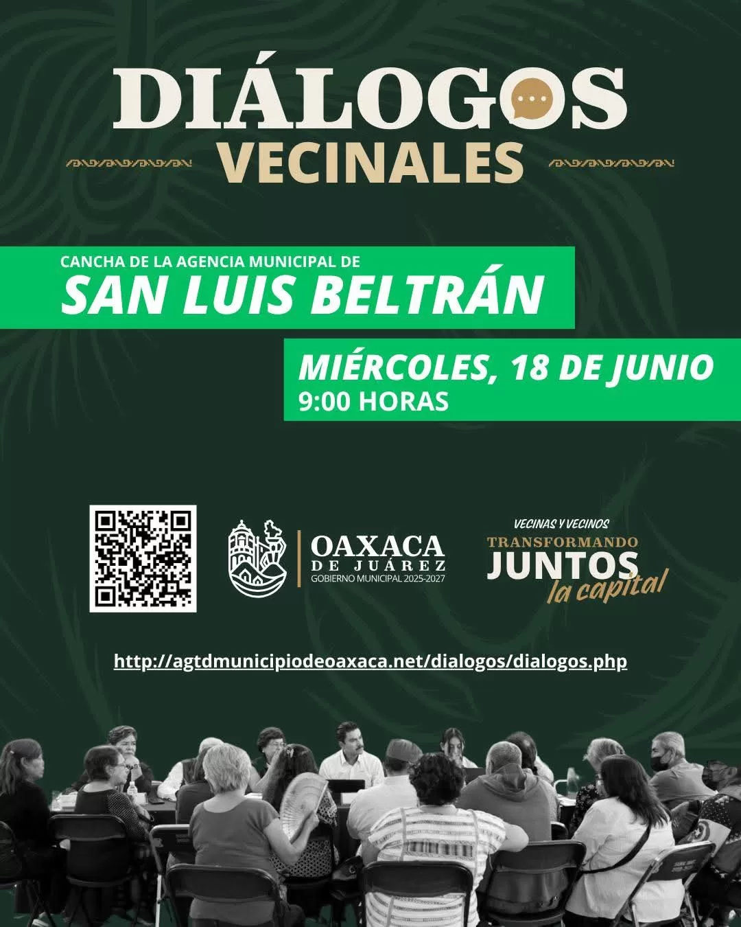 Oaxaca de Juárez, Oax., 17 de junio de 2025.– El Gobierno Municipal de Oaxaca de Juárez invita a la ciudadanía a participar en una nueva edición de los Diálogos Vecinales, que en esta ocasión se llevará a cabo en la cancha de la agencia municipal de San Luis Beltrán, este miércoles 18 de junio a partir de las 9:00 horas.