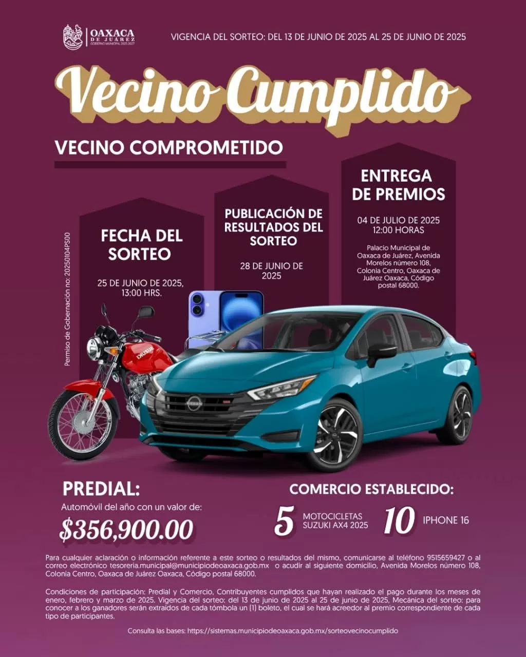 Oaxaca de Juárez, Oax. 20 de junio de 2025.– El Municipio de Oaxaca de Juárez informa que, como parte del programa “Vecino Cumplido, Vecino Comprometido”, se llevará a cabo un sorteo para reconocer a las ciudadanas y ciudadanos que realizaron su pago del impuesto Predial o de Comercio durante los meses de enero, febrero o marzo del presente año.