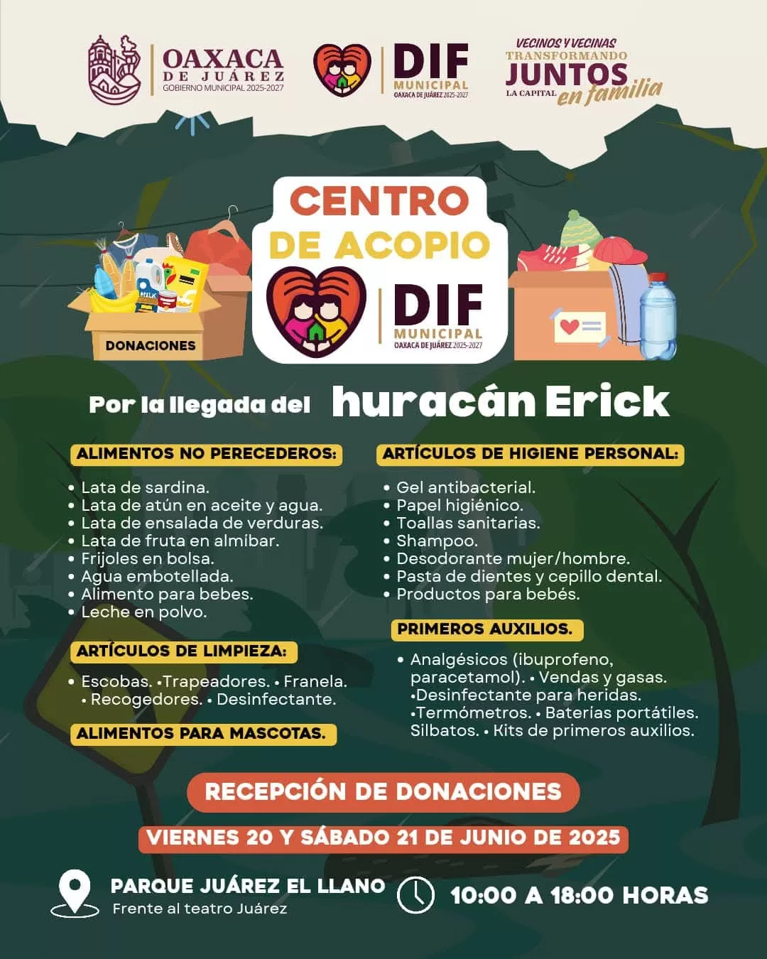 Oaxaca de Juárez, Oax., 21 de junio de 2025.- El Municipio de Oaxaca de Juárez informa que este sábado continúa abierto el centro de acopio instalado en el Parque Juárez El Llano, frente al Teatro Juárez, como parte de la jornada solidaria para apoyar a las personas damnificadas por el paso del huracán Erick en la región de la Costa.