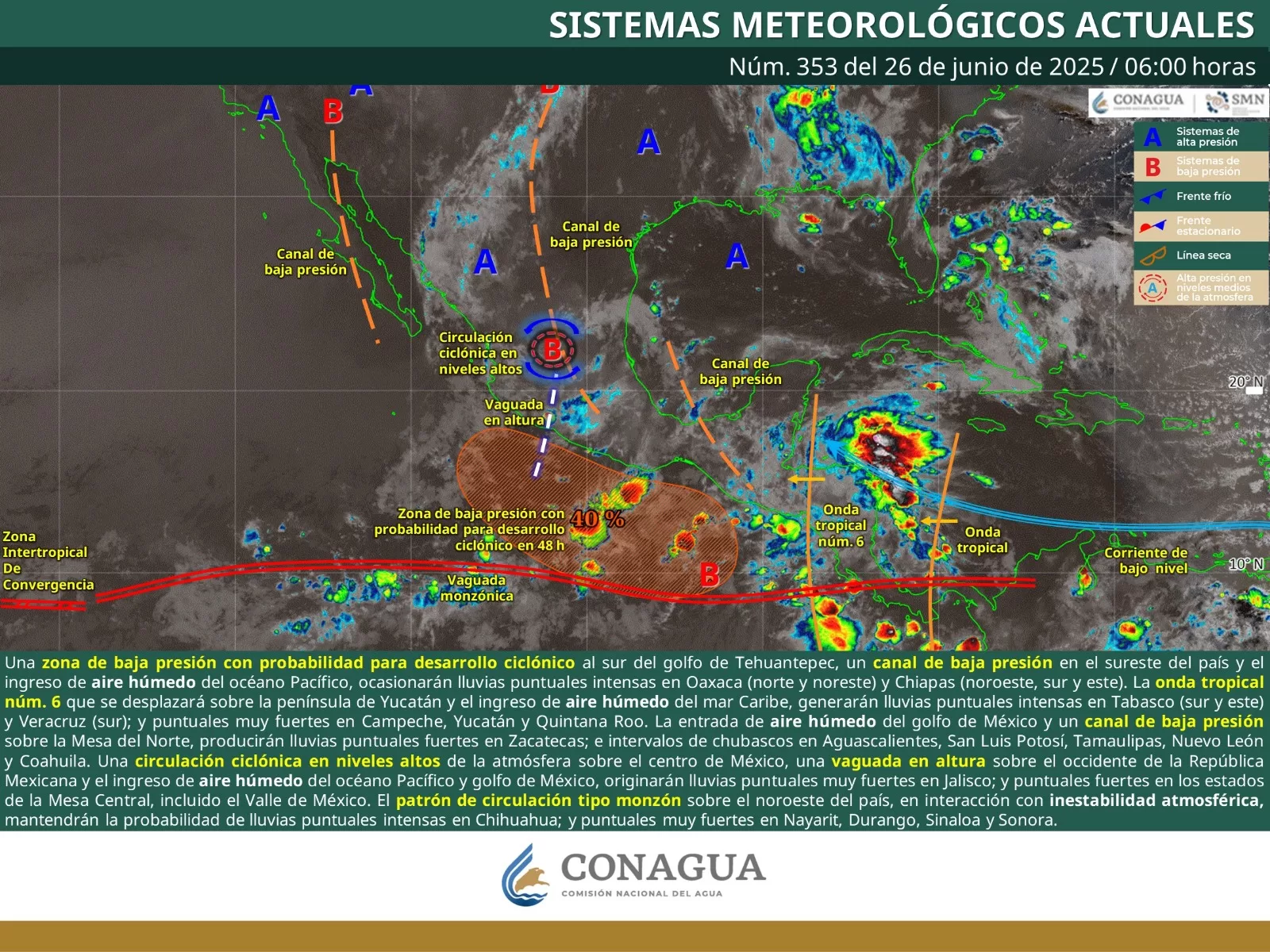 De acuerdo con el pronóstico del tiempo emitido por la Comisión Nacional del Agua (Conagua), todas estas condiciones se deben al flujo de humedad que impulsa la vaguada monzónica, un canal de baja presión sobre el sureste de México, con potencial alto para desarrollo ciclónico a siete días, ubicado al sur de Guatemala y México, y el ingreso de la onda tropical número 6 sobre el sureste.