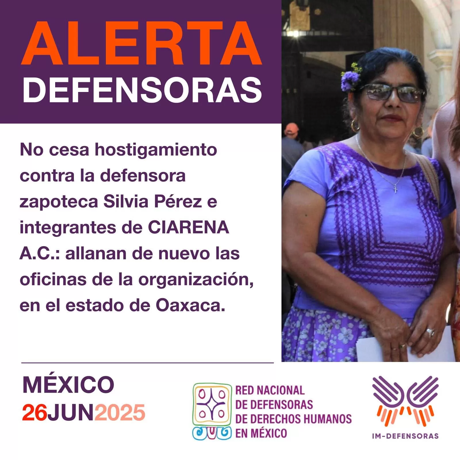 Este sería el segundo hecho en pocos meses, luego de que el pasado 27 de febrero fuera vulnerado el domicilio de Pérez Yescas, donde sustrajeron equipo de cómputo con información sensible sobre el trabajo que desarrolla la organización en comunidades del Istmo de Tehuantepec. Desde entonces, la defensora ha sido objeto de amenazas de muerte y acoso, situación que la obligó a desplazarse de su comunidad de origen, Santa María Lombardo, en el municipio de San Juan Cotzocón Mixe.