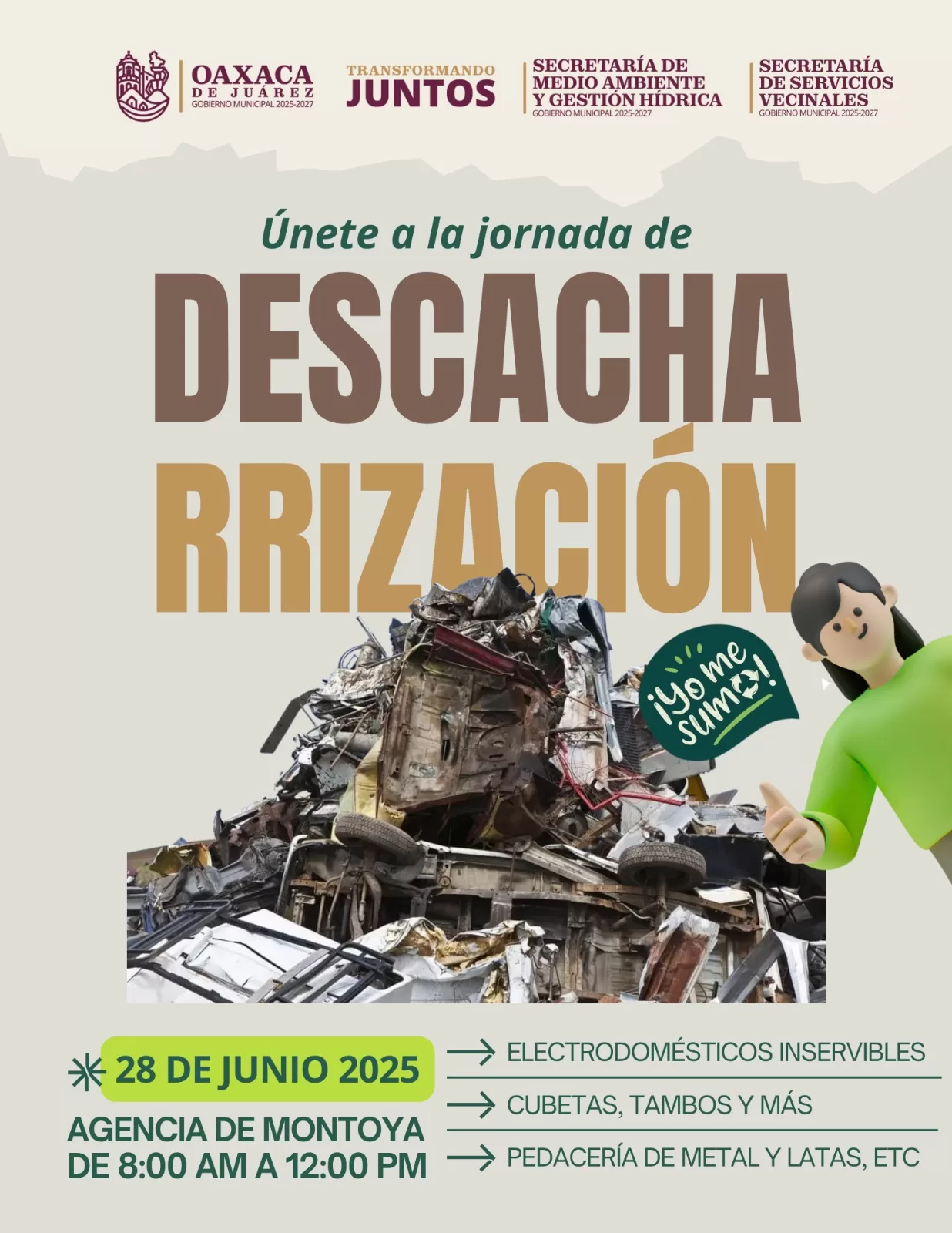 Oaxaca de Juárez, Oax., 27 de junio de 2025.- Para promover la salud pública, el orden urbano y el cuidado del medio ambiente, el Gobierno Municipal de Oaxaca de Juárez, a través de la Secretaría de Medio Ambiente y Gestión Hídrica y la Secretaría de Servicios Vecinales, invita a las y los vecinos a participar en la jornada de descacharrización que se llevará a cabo este 28 de junio en la Agencia de Montoya, en un horario de 8:00 a 12:00 horas.