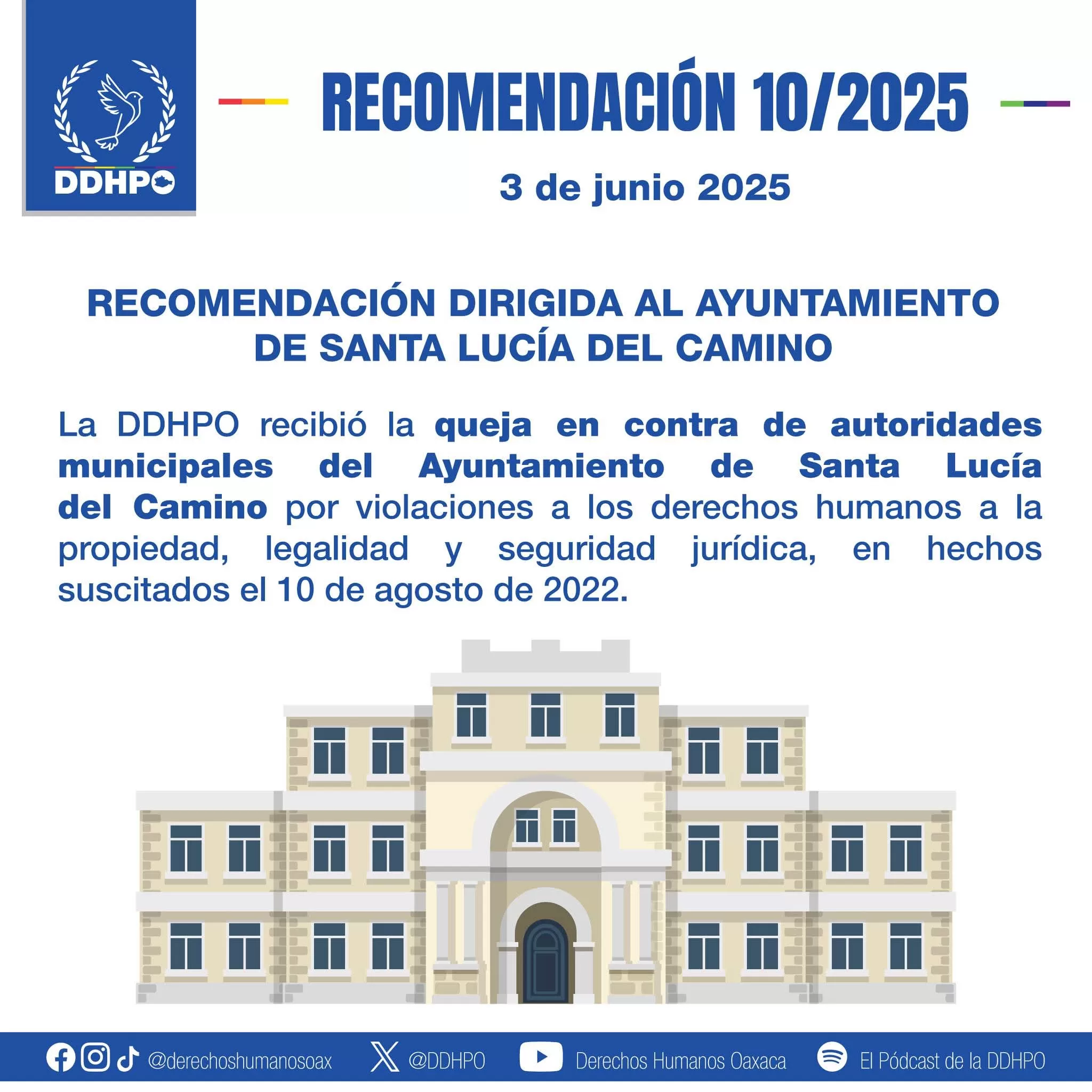 La Defensoría de los Derechos Humanos del Pueblo de Oaxaca emitió la Recomendación 10/2025 dirigida a integrantes del cabildo municipal del H. Ayuntamiento de Santa Lucía del Camino por violaciones a los derechos humanos a la propiedad, legalidad y seguridad jurídica en agravio de seis personas, entre ellas personas mayores.