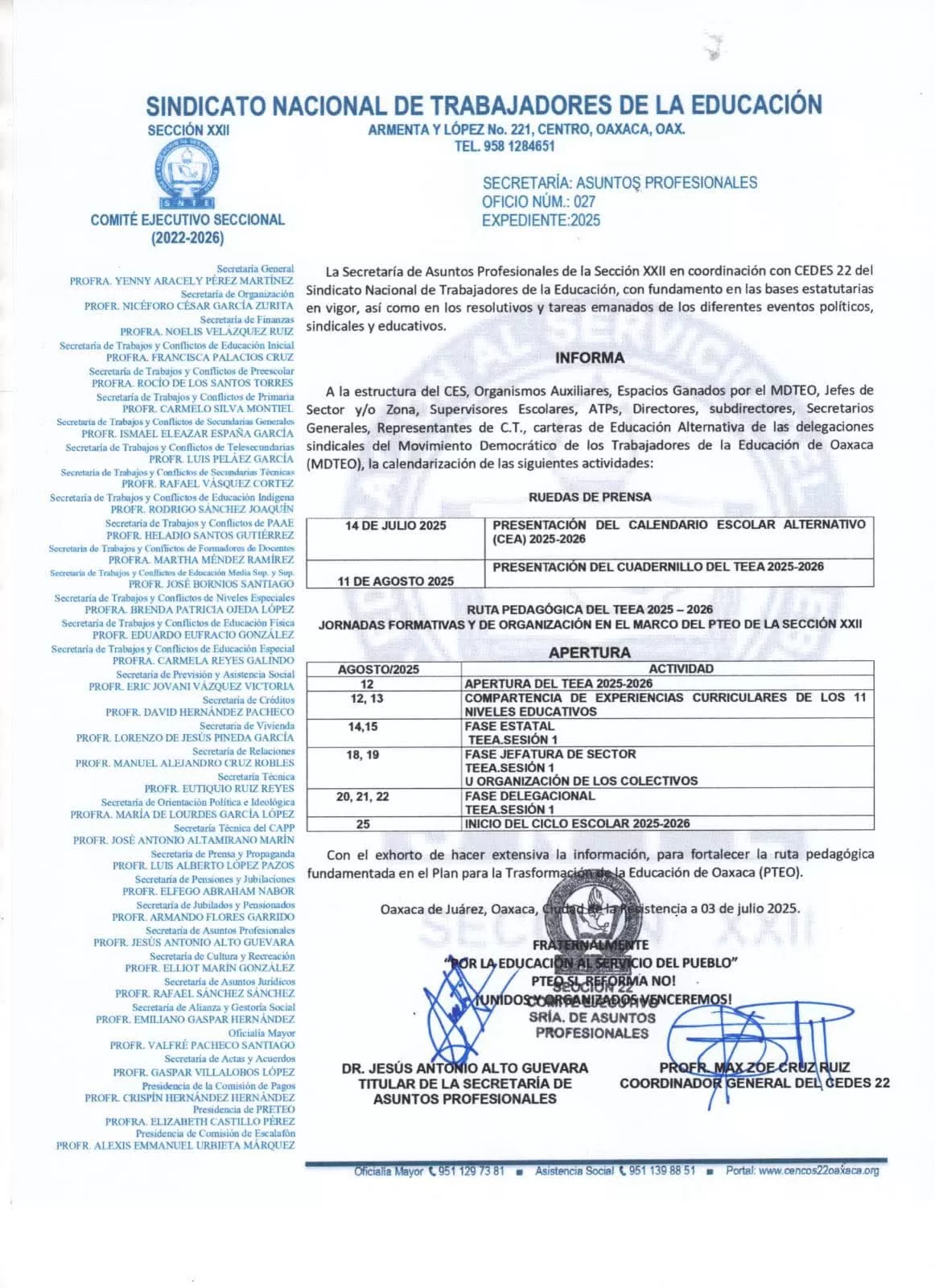 En el marco del Movimiento Democrático de los Trabajadores de la Educación de Oaxaca (MDTEO), la Sección XXII del SNTE-CNTE, a través de la Secretaría de Asuntos Profesionales en coordinación con CEDES 22, dio a conocer las fechas que marcan el arranque de la Ruta Pedagógica correspondiente al ciclo escolar 2025-2026, en apego al Proyecto de Transformación de la Educación de Oaxaca (PTEO).