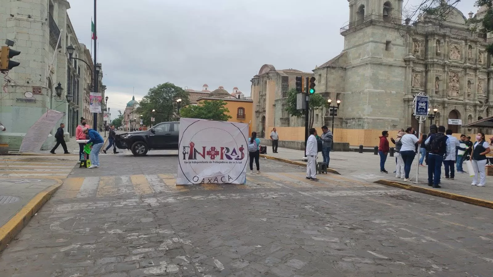 La mañana de este martes, un grupo de aproximadamente 20 integrantes de la Fuerza Independiente de Trabajadores de la Salud (Fintras Nacional) bloqueó la avenida Independencia, a la altura de la calle García Vigil, en el Centro Histórico de la ciudad. Con una camioneta negra atravesada sobre la vialidad, los manifestantes impidieron el paso vehicular, lo que generó afectaciones en una de las zonas de mayor tránsito en la capital oaxaqueña.