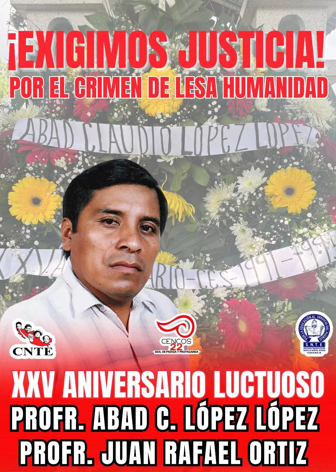Este miércoles se llevó a cabo un acto conmemorativo en memoria de los profesores Juan Rafael Ortiz y Abad Claudio López López, asesinados el 9 de julio del año 2000 en la recta de Malpica, en la región de la Costa oaxaqueña. El homenaje marcó el XXV aniversario luctuoso de los docentes, quienes formaban parte de la Delegación Sindical D-I-258, del Sector Putla.
