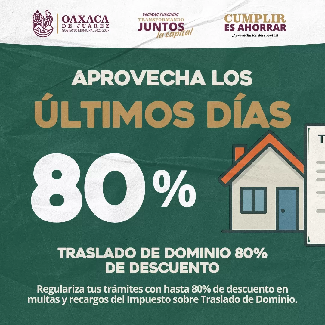 Oaxaca de Juárez, Oax., 16 de julio de 2025.- El Municipio de Oaxaca de Juárez recuerda a la ciudadanía que, durante el mes de julio, continúan vigentes los estímulos fiscales para regularizar el pago del Impuesto sobre Traslado de Dominio, con descuentos de hasta el 80 por ciento en multas y recargos.