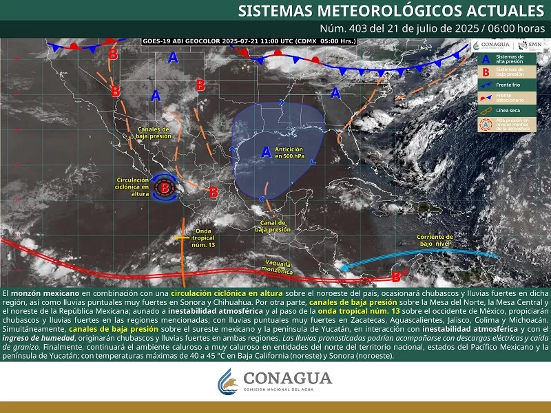 Oaxaca de Juárez, Oax. 21 de julio de 2025.- La Coordinación Estatal de Protección Civil y Gestión de Riesgos (CEPCyGR) informa que, se espera la posibilidad de áreas de tormentas asociadas con actividad eléctrica en horas de la tarde y noche, al momento de la lluvia o tormenta pueden registrarse vientos lineales fuertes, acompañados con periodos cortos de precipitación en forma de chubascos fuertes.