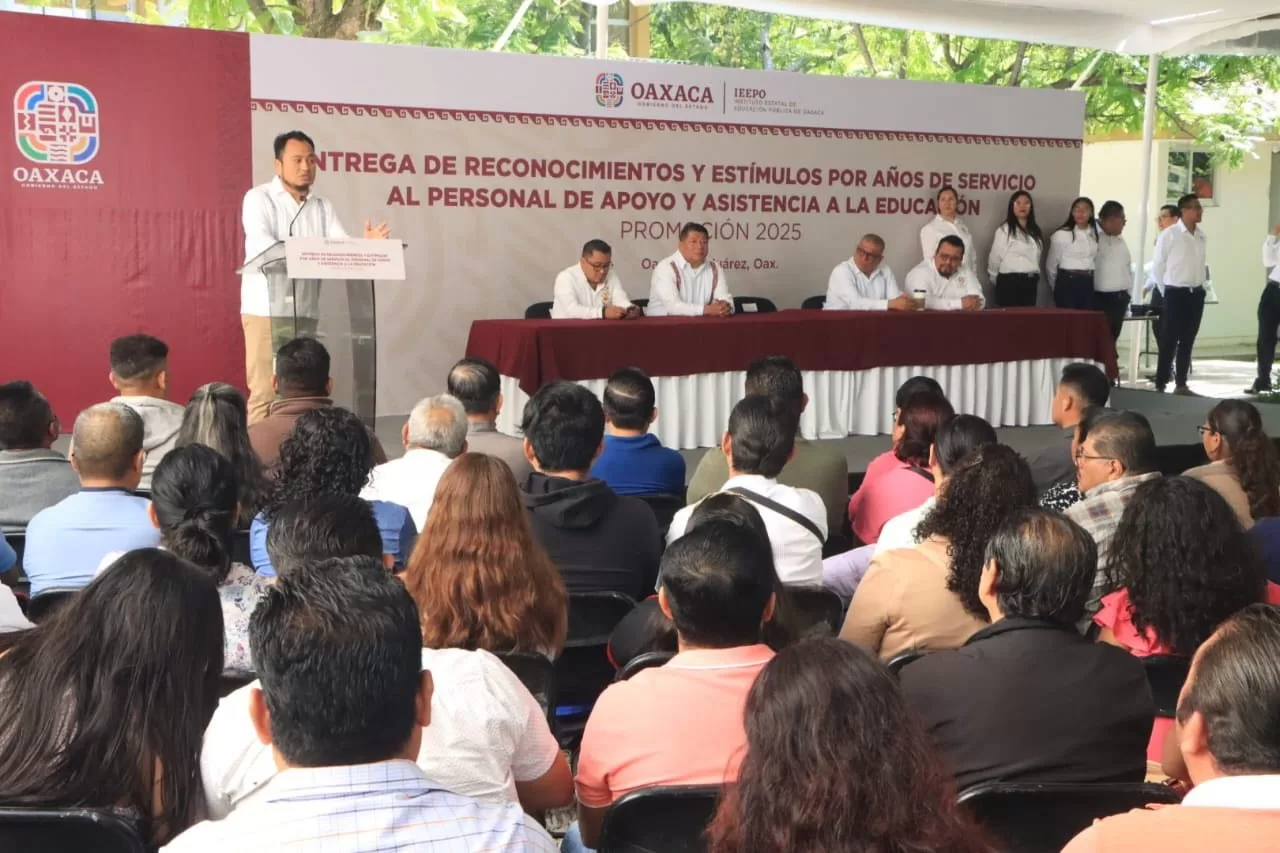 Oaxaca de Juárez, Oax. 22 de julio de 2025.- Muestra del compromiso con los derechos laborales del magisterio oaxaqueño, el Instituto Estatal de Educación Pública de Oaxaca (IEEPO) inició la entrega de 2 mil 238 reconocimientos y estímulos económicos al Personal de Apoyo y Asistencia a la Educación (PAAE) con 45, 40, 35, 30, 25, 20, 15 y 10 años de servicio de la Promoción 2025.