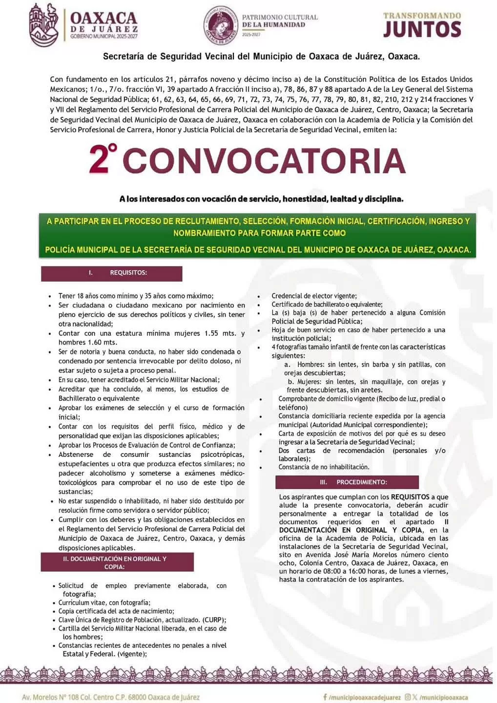 Oaxaca de Juárez, Oax., 22 de julio de 2025.- El Municipio de Oaxaca de Juárez, a través de la Secretaría de Seguridad Vecinal, emitió la segunda convocatoria del año para participar en el proceso de reclutamiento, selección, formación inicial, certificación e ingreso a la Policía Municipal, dirigida a personas con vocación de servicio, honestidad, lealtad y disciplina.