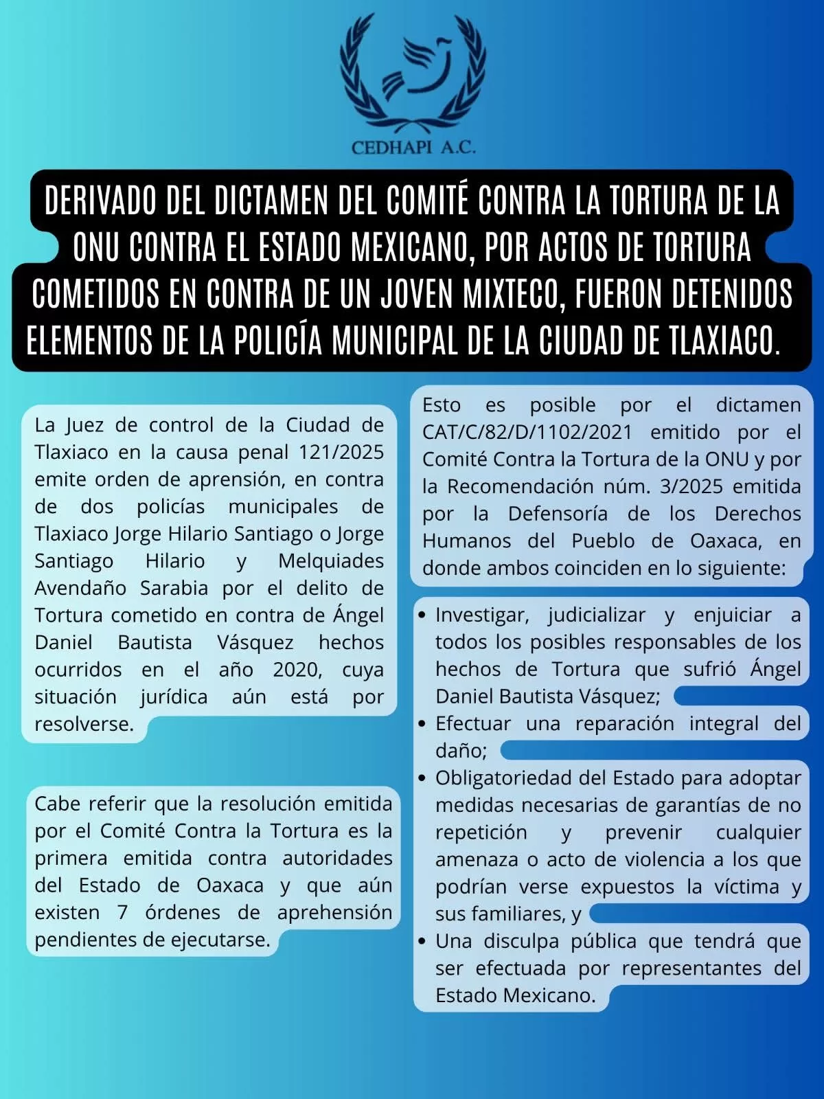 En un hecho sin precedentes en Oaxaca, el Comité Contra la Tortura de la Organización de las Naciones Unidas (ONU) emitió un dictamen en el que responsabiliza al Estado Mexicano por actos de tortura cometidos por elementos de la Policía Municipal de Tlaxiaco en contra del joven mixteco Ángel Daniel Bautista Vásquez, quien fue agredido brutalmente en 2020.