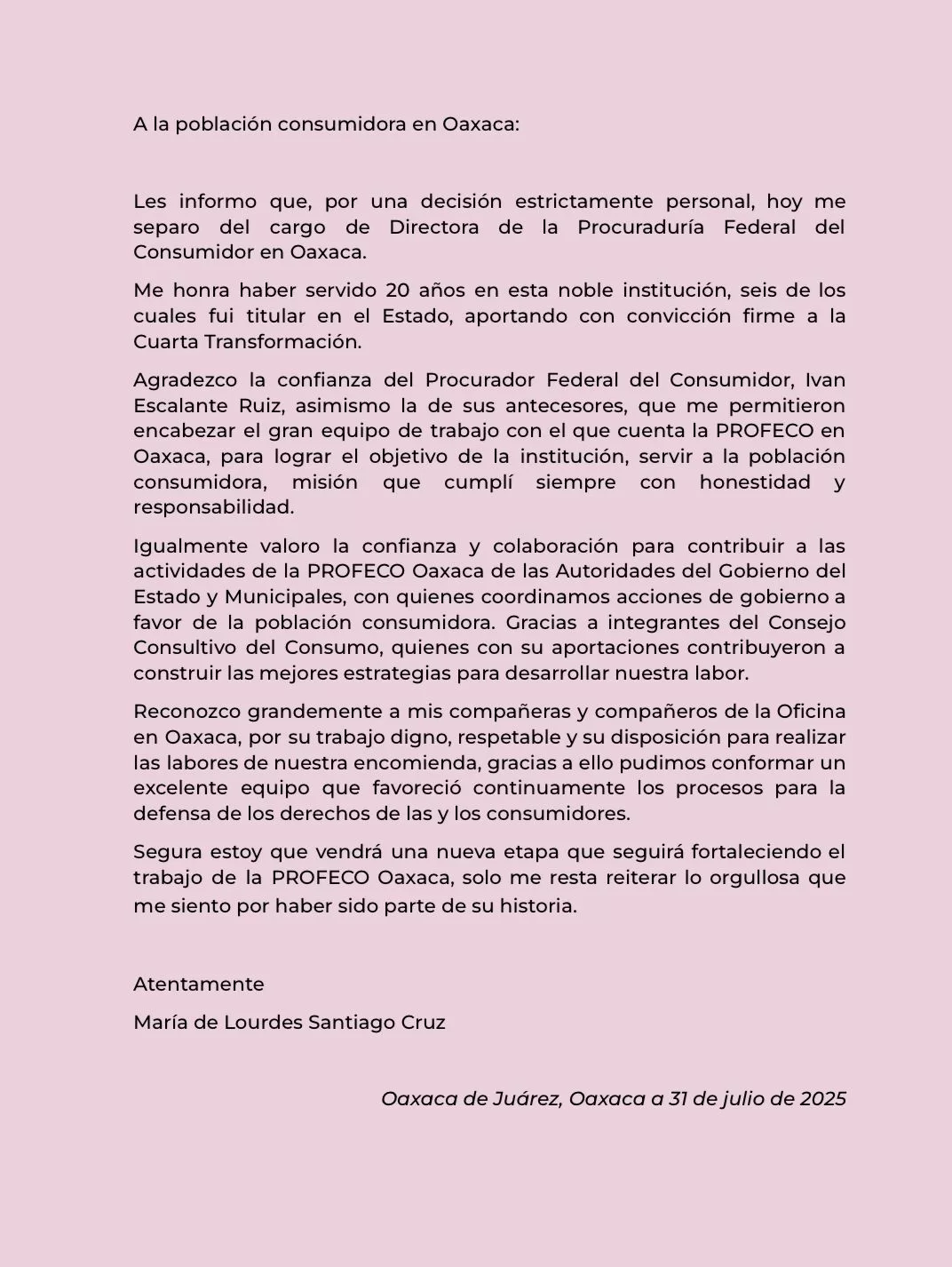 María de Lourdes Santiago Cruz anunció este jueves su separación del cargo como directora de la Oficina de la Procuraduría Federal del Consumidor (PROFECO) en Oaxaca, decisión que calificó como “estrictamente personal”, luego de seis años al frente de la dependencia.