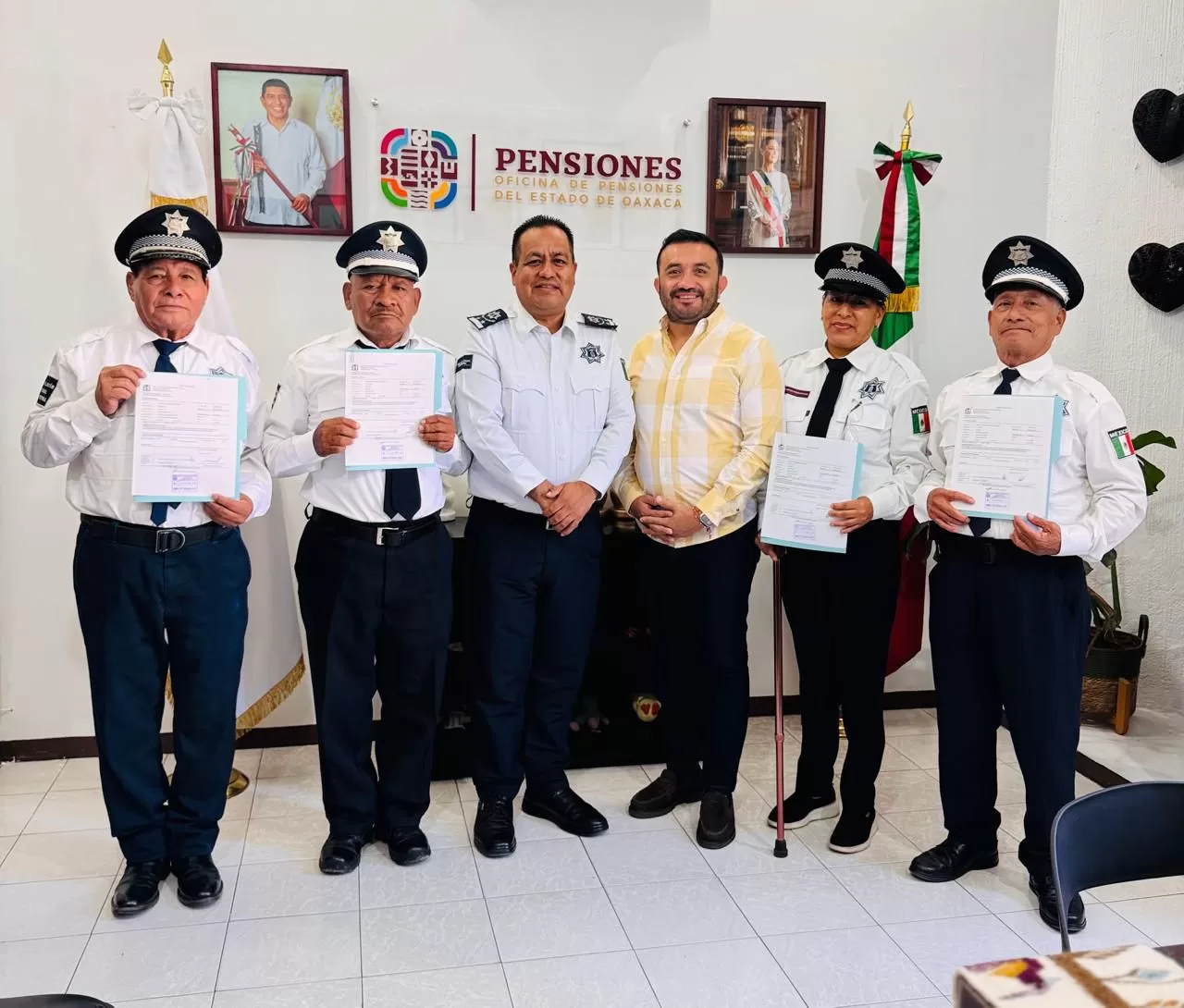 Oaxaca de Juárez, Oax. 4 de agosto de 2025.- En respuesta al compromiso del Gobernador Salomón Jara Cruz, el director general de la Oficina de Pensiones del Estado, José Elpidio Altamirano López encabezó la entrega de contratos de afiliación al Instituto Mexicano del Seguro Social (IMSS) a elementos de la Policía Vial Estatal que han solicitado y cumplido con los requisitos para acceder a este derecho.