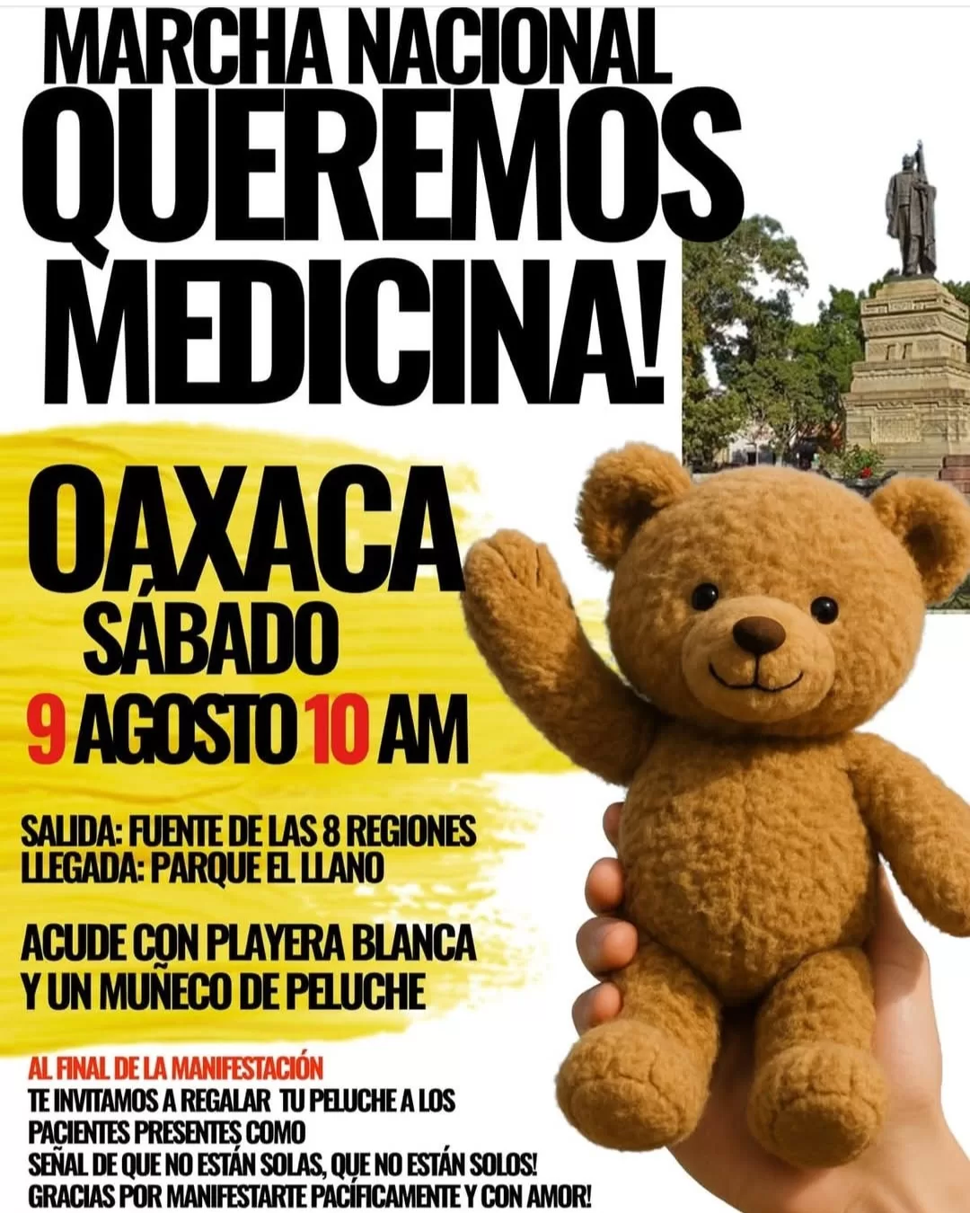 La movilización está prevista para el próximo sábado 9 de agosto a las 10:00 de la mañana, con punto de salida en la Fuente de las Ocho Regiones, rumbo al Parque El Llano. Se hace un llamado a pacientes, trabajadores del sector salud, estudiantes del área blanca, organizaciones civiles y a la sociedad en general a unirse a esta causa común.