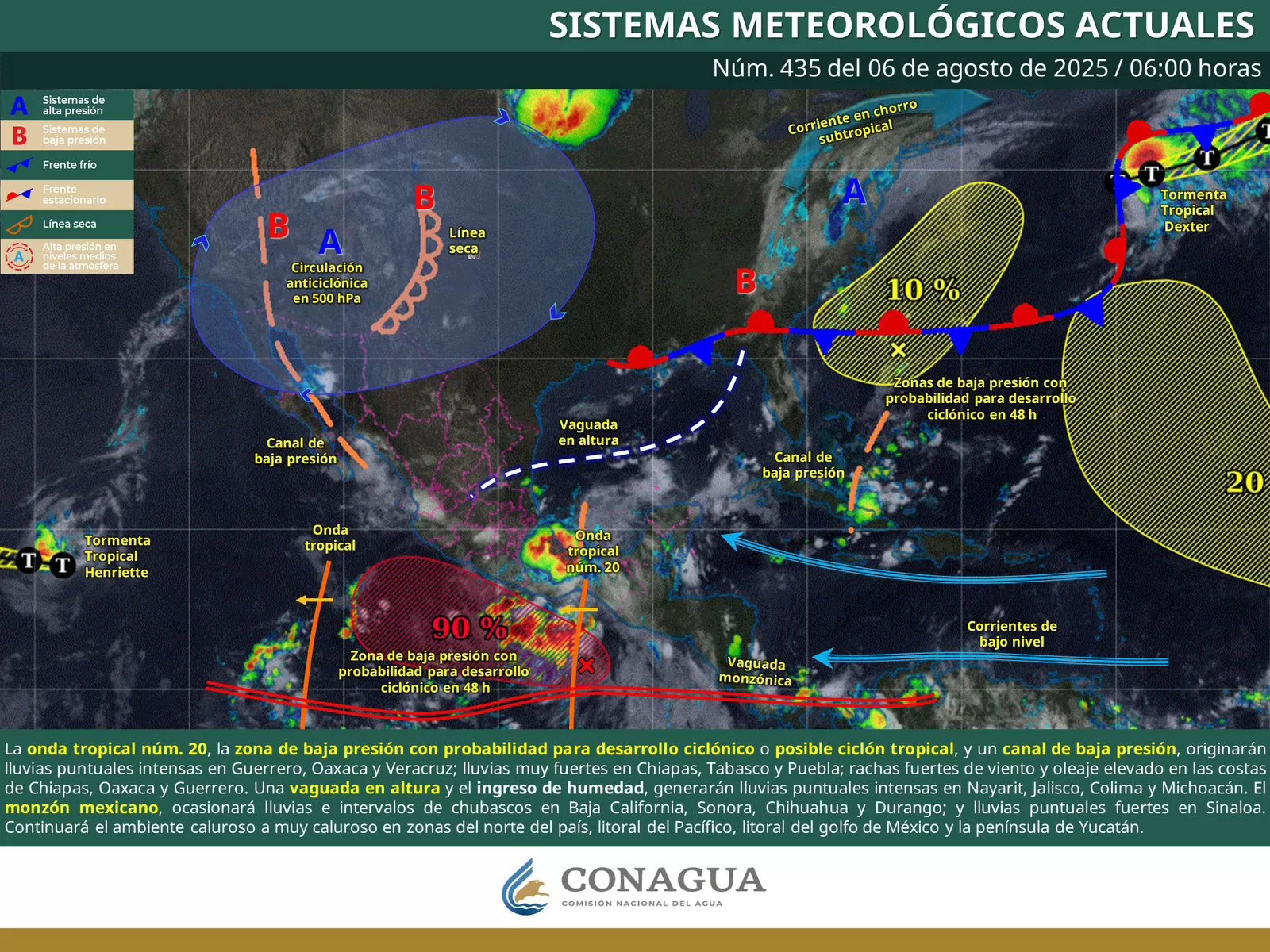 También se prevé oleaje elevado, mar de leva y fuertes corrientes de resaca en la línea de costa. Todo esto debido a la onda tropical número 20 que será absorbida por la zona de baja presión con alta probabilidad de desarrollo ciclónico, mismas que seguirá desplazándose paralela a las costas de Oaxaca y Chiapas.