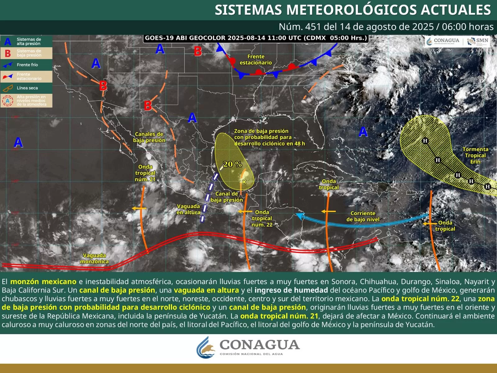 Todo esto debido a la entrada de humedad de los Océanos Atlántico y Pacífico, una baja superior y la cercanía de la onda tropical número 22, asociada con un centro de baja presión con probabilidad baja de desarrollo ciclónico.