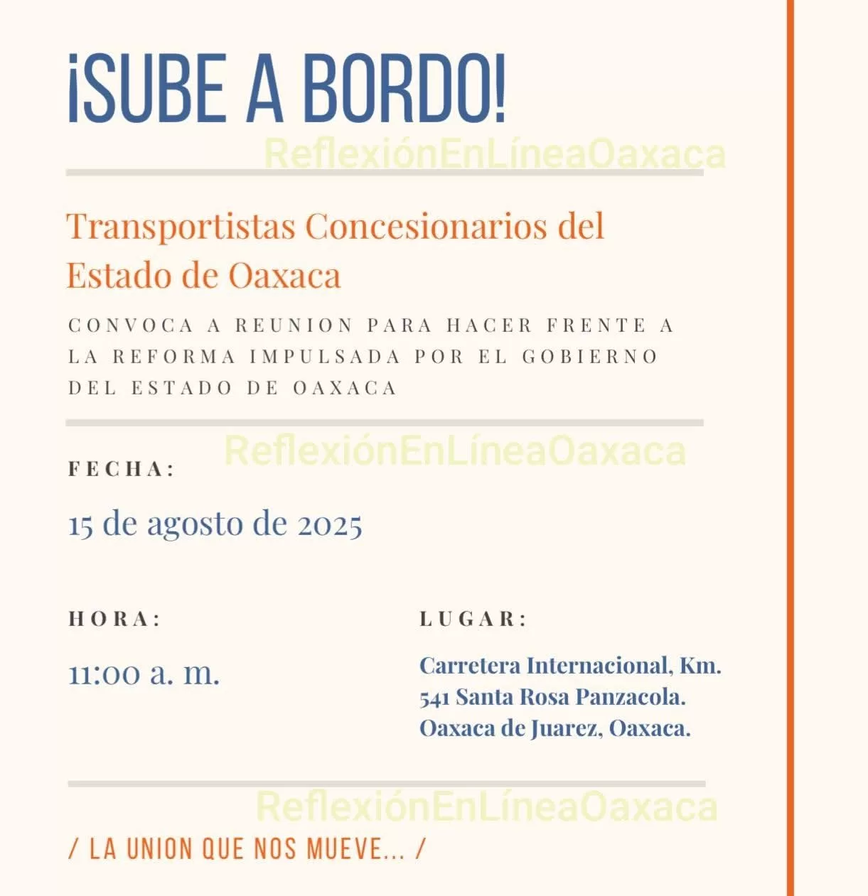 Concesionarios y trabajadores del transporte urbano y suburbano en Oaxaca convocaron a una reunión urgente para este viernes 15 de agosto a las 11:00 horas, en la Carretera Internacional, kilómetro 541, en Santa Rosa Panzacola, con el objetivo de definir acciones en contra de la reforma impulsada por el Gobierno del Estado y la próxima implementación del proyecto BinniBus.
