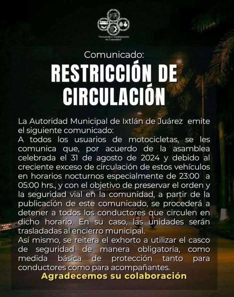 Autoridades municipales de Ixtlán de Juárez informaron que entró en vigor la restricción a la circulación de motocicletas en el municipio y su carretera principal entre las 23:00 y las 05:00 horas, como parte de un acuerdo aprobado en Asamblea Comunitaria el 31 de agosto de 2024.