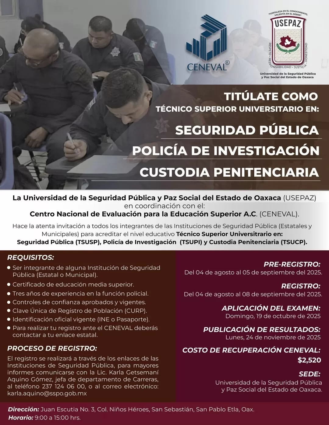 Oaxaca de Juárez, Oax. 18 de agosto de 2025.- La Universidad de la Seguridad Pública y Paz Social del Estado de Oaxaca (Usepaz) invita a integrantes de instituciones de protección pública estatales y municipales, a acreditar el nivel educativo Técnico Superior Universitario en: Seguridad Pública (TSUSP), Policía de Investigación (TSUPI) o Custodia Penitenciaria (TSUCP).