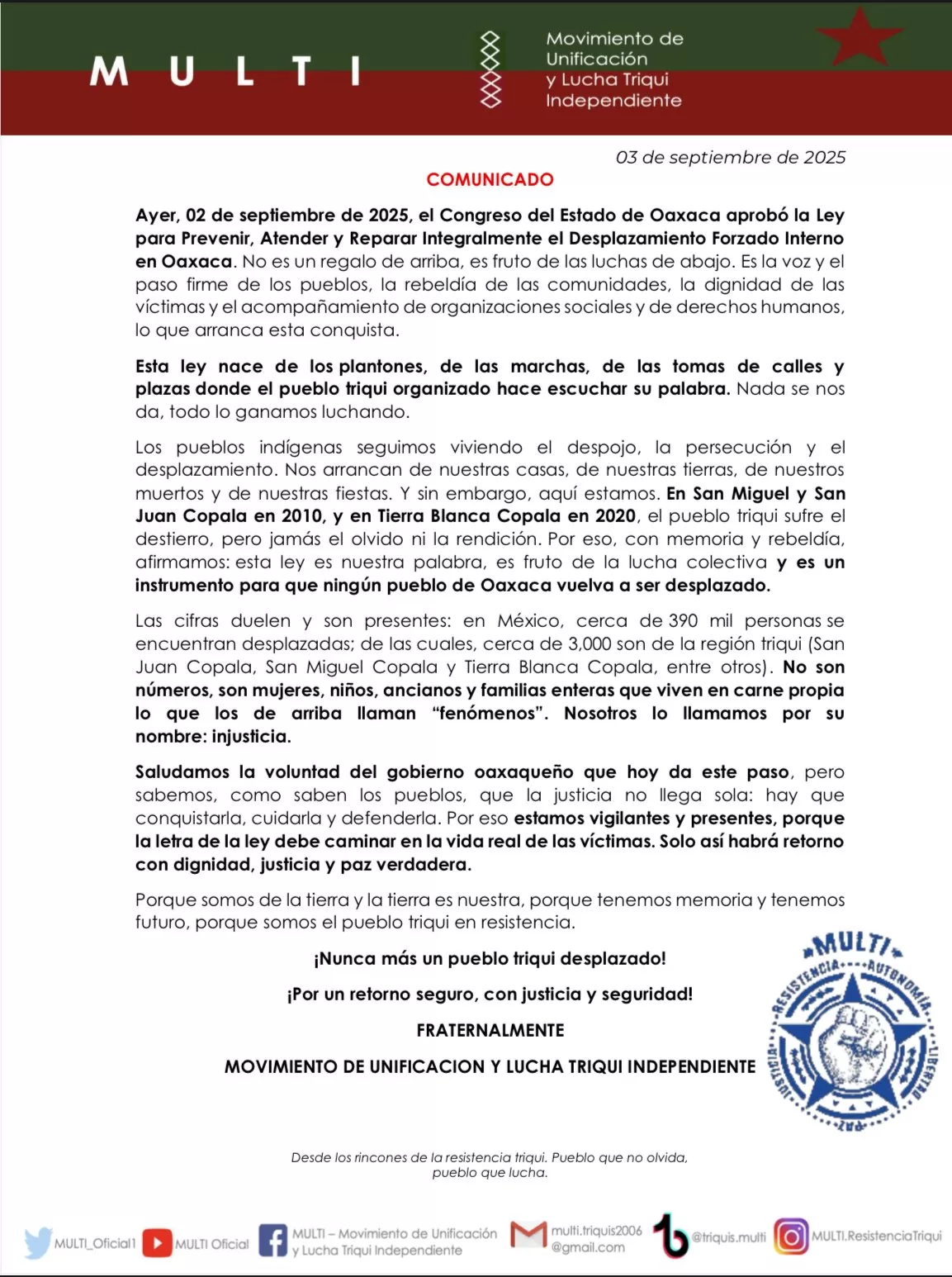 El Movimiento de Unificación y Lucha Triqui Independiente (MULTI) destacó que la aprobación de esta legislación no constituye un regalo de las autoridades, sino el resultado de años de resistencia, movilizaciones y exigencias de los pueblos indígenas y comunidades afectadas por el desplazamiento.