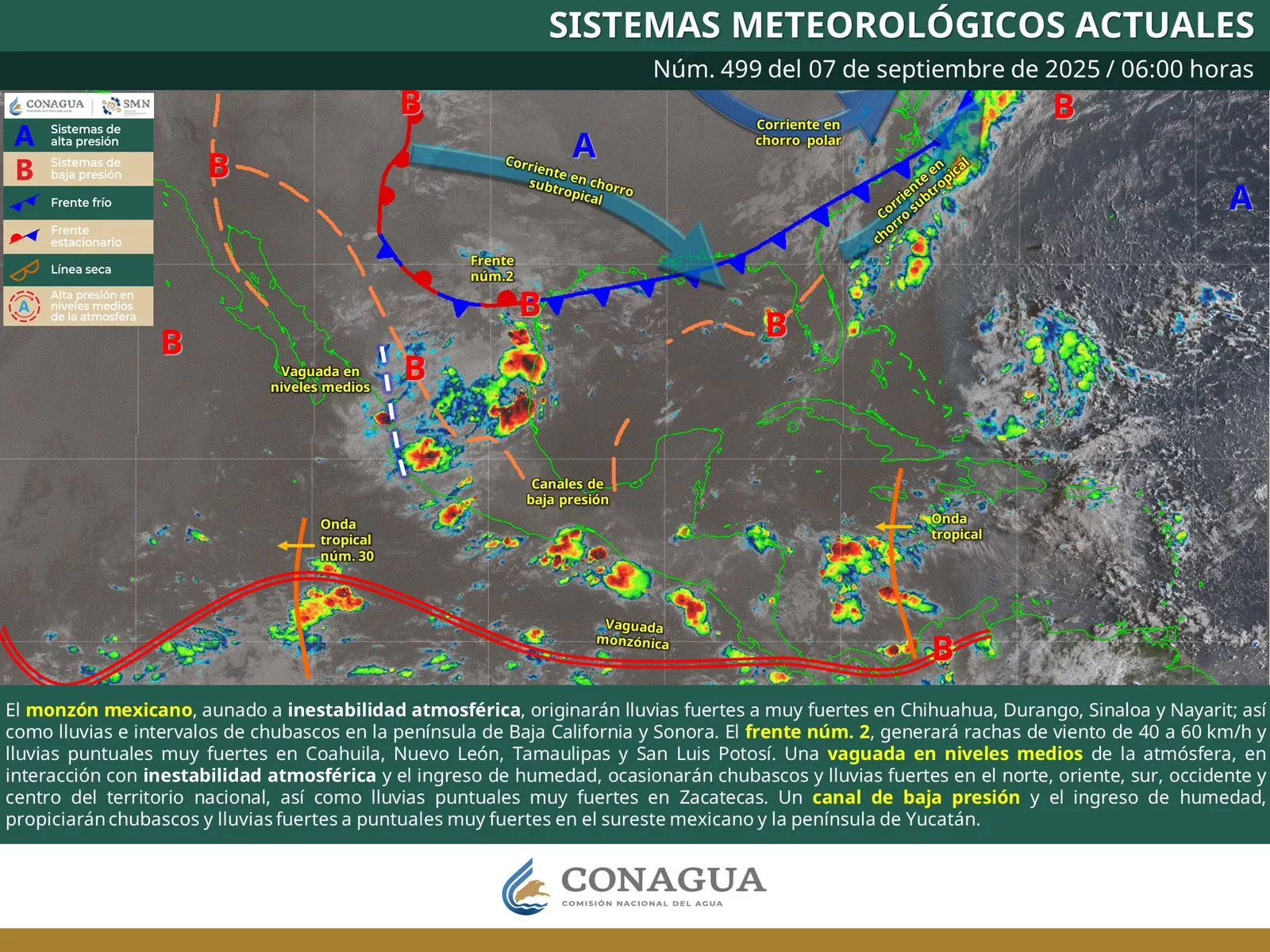 Oaxaca de Juárez, Oax. 7 de septiembre de 2025.-La Coordinación Estatal de Protección Civil y Gestión de Riesgos (CEPCyGR) informa que, se prevén lluvias y tormentas ocasionales localmente fuertes con mayor énfasis en la Sierra Sur, Cuenca del Papaloapan y lugares aislados del Istmo de Tehuantepec y Costa.