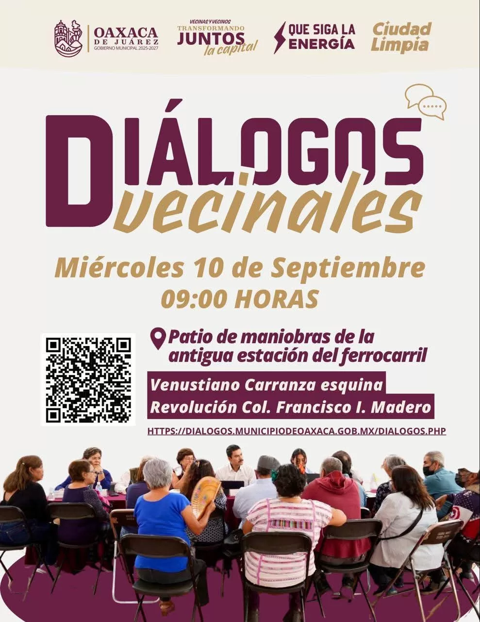Oaxaca de Juárez, Oax., 9 de septiembre de 2025.- El Gobierno Municipal de Oaxaca de Juárez convoca a todas las vecinas y vecinos a participar en la próxima edición de los Diálogos Vecinales, un ejercicio de cercanía y escucha directa con la ciudadanía.