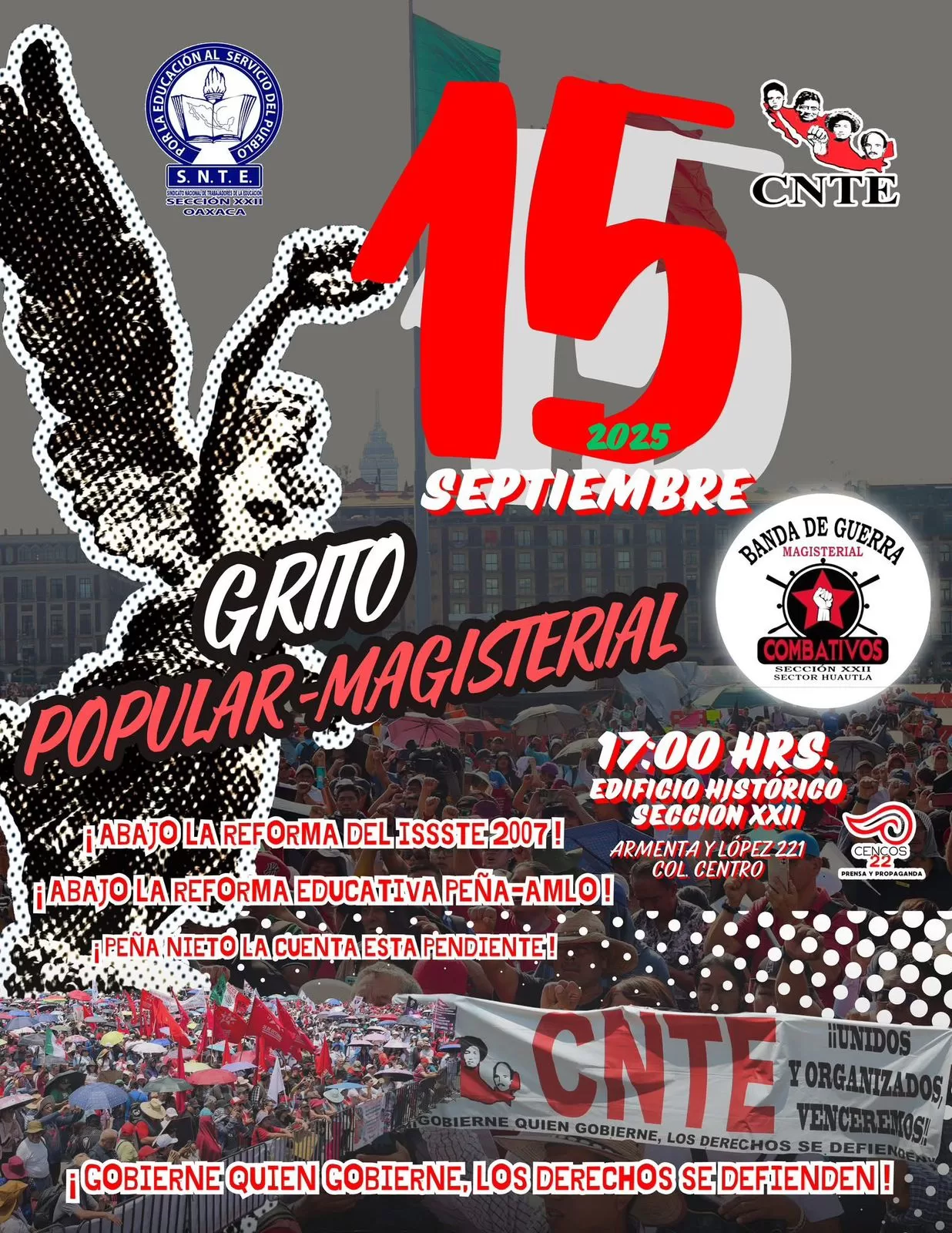 La Sección 22 de la Coordinadora Nacional de Trabajadores de la Educación (CNTE) anunció la realización del “Grito Popular Magisterial” el próximo 15 de septiembre a las 17 horas en el Edificio Histórico ubicado en la calle de Armenta y López, con motivo de la conmemoración del inicio de la lucha de los pueblos de México contra el colonialismo.
