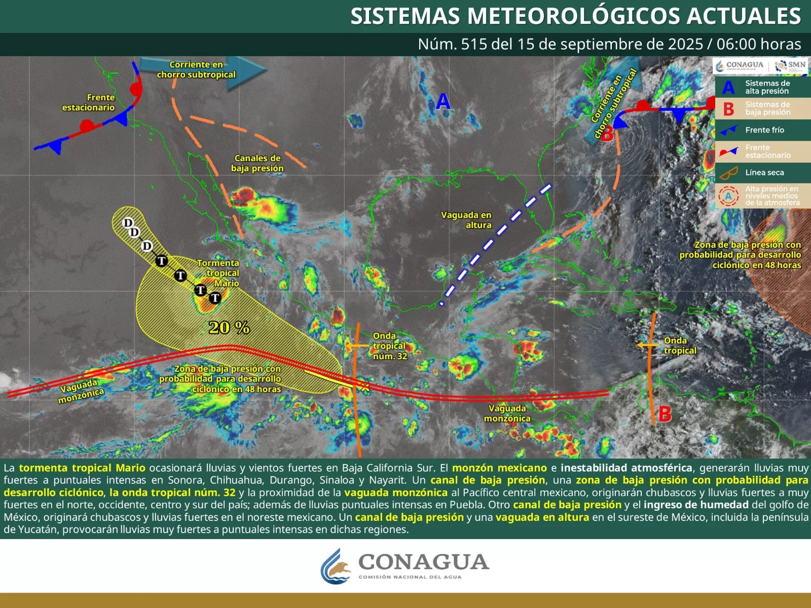 De acuerdo con el pronóstico del tiempo emitido por la Comisión Nacional del Agua (Conagua), estas condiciones son debido a la onda tropical número 32 combinada con una zona de baja presión y la cercanía a la línea de costa de la vaguada monzónica.