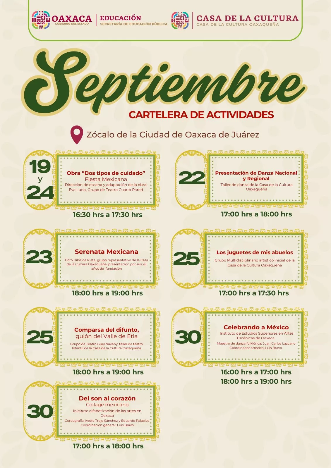 Oaxaca de Juárez, Oax. 17 de septiembre de 2025. El zócalo de la ciudad capital será el escenario que albergará del 19 al 30 de septiembre, diversas actividades como parte del programa mensual que presenta la Casa de la Cultura Oaxaqueña (CCO).