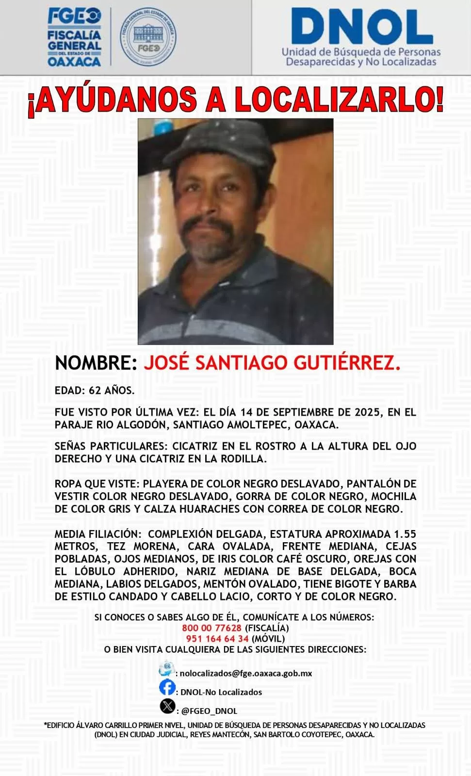Oaxaca de Juárez, Oax., a 17 de septiembre de 2025.- En coordinación con autoridades estatales y federales, la Fiscalía General del Estado de Oaxaca (FGEO) implementa un operativo de búsqueda y localización de José Santiago Gutiérrez, de 62 años, mediante acciones estratégicas realizadas por equipos multidisciplinarios en Santiago Amoltepec.