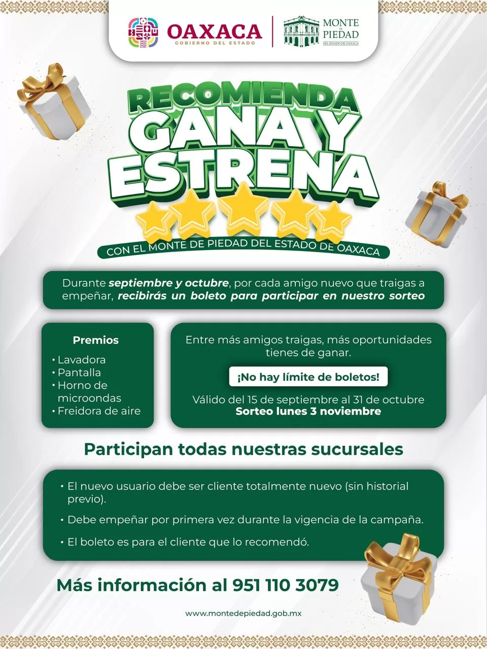 Oaxaca de Juárez, Oax. 17 de septiembre de 2025.- El Monte de Piedad del Estado de Oaxaca invita a las y los oaxaqueños a participar en el sorteo “Recomienda, Gana y Estrena”, que se llevará a cabo el próximo 3 de noviembre, para premiar la confianza de sus pignorantes e incentivar la llegada de nuevas personas usuarias a las sucursales.