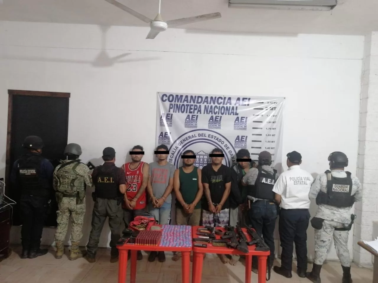 También, se detuvo a J.A.S.T. de 29 años, originario de Cuernavaca, Morelos; J.B.M. de 21 años y S.N.G. de 33 años, ambos de Buena Vista, Oaxaca; J.D.M.B. de 22 años, de Santiago Pinotepa Nacional, Oaxaca y A.D.D. de 22 años, de Santiago Llano Grande, Oaxaca.