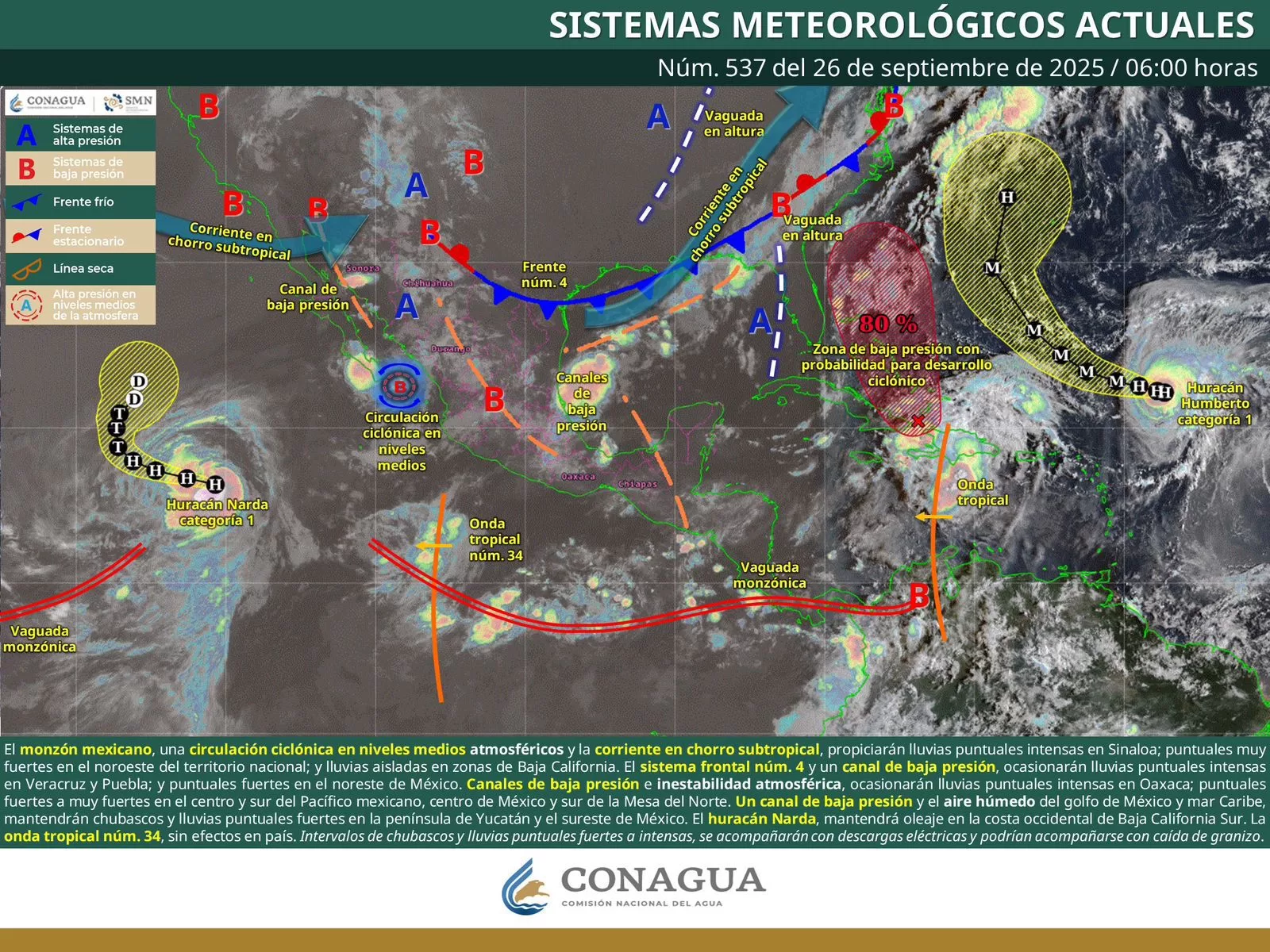Todas estas condiciones son ocasionadas por la vaguada monzónica, un canal de baja presión y el frente frío número 4.