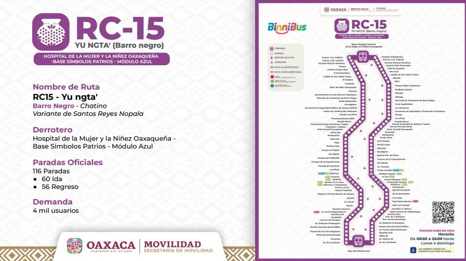 Por su parte la directora del BinniBus, Karina Gómez Esteban detalló que por el reordenamiento de trayectos se fusionan las rutas RC02 y RC04 para integrar la RC15 Hospital de la Mujer y la Niñez Oaxaqueña – Base Símbolos Patrios – Módulo Azul, denominada YU NGTA’, que significa Barro Negro en lengua chatina de Santos Reyes Nopala. Contará con 116 paradas oficiales, 60 de ida y 56 de regreso y operará en un horario de 6:30 a 22:00 horas.