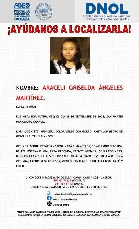 La joven, identificada como Araceli Griselda Á. M., fue reportada como no localizada el 28 de septiembre en San Martín Mexicapam, de acuerdo con la ficha de búsqueda emitida por la Fiscalía General del Estado de Oaxaca (FGEO).