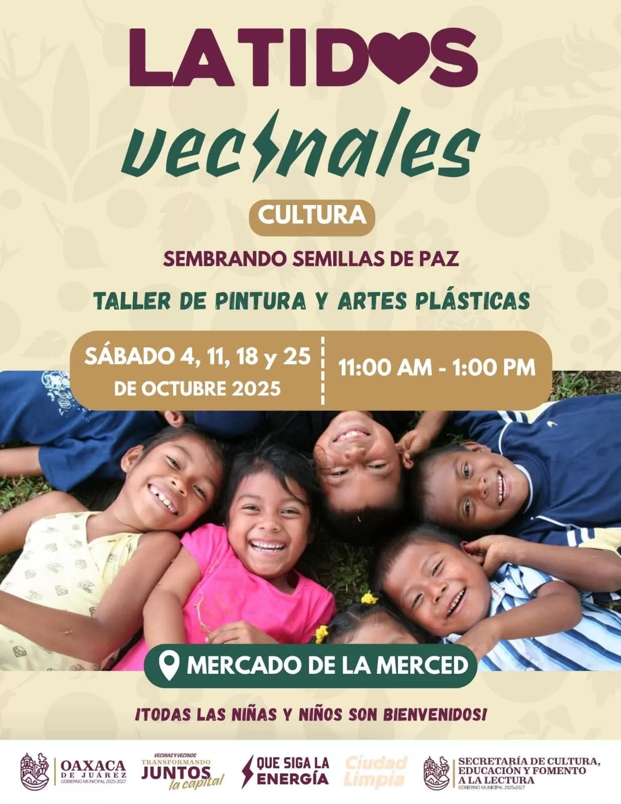 La jornada de Latidos Vecinales, que implementa el municipio de Oaxaca de Juárez, llegará al Mercado de la Merced con actividades culturales, recreativas y educativas pensadas para niñas, niños y sus familias, con el objetivo de fomentar la convivencia y fortalecer el tejido social a través del arte y la creatividad.