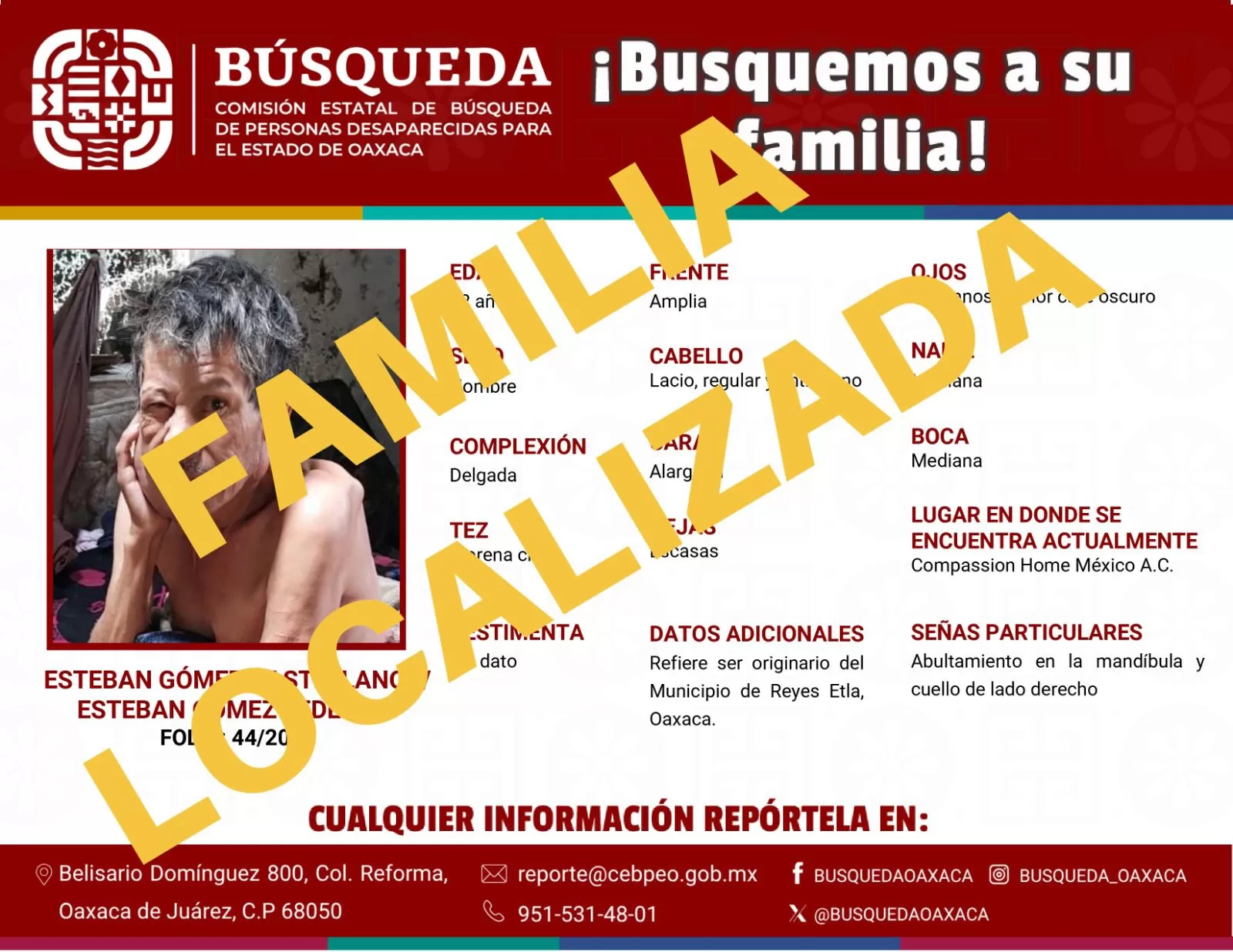 Mediante el trabajo conjunto fue posible establecer comunicación con el núcleo familiar de la persona identificada como F. E. G. C., originario de Reyes Etla; quien había permanecido más de cuatro décadas sin contacto con su familia, que ahora podrá brindarle un digno descanso en su tierra natal.