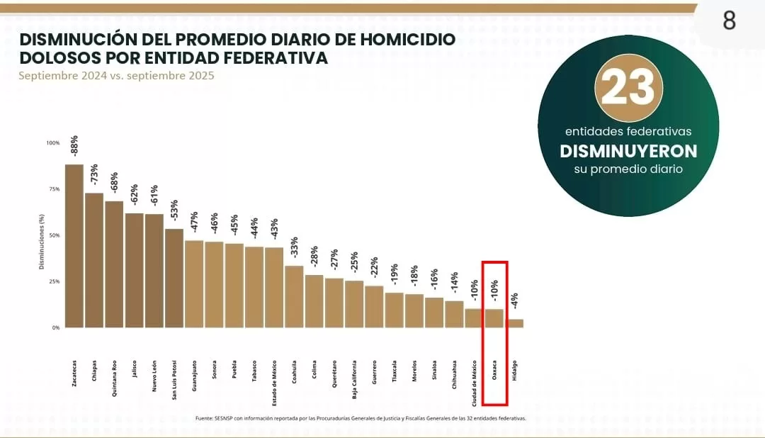 Oaxaca de Juárez, Oax., 7 de octubre de 2025.- Oaxaca logró una reducción del 10 por ciento en la incidencia del delito de homicidio doloso entre septiembre de 2024 y septiembre de 2025, informó el Secretariado Ejecutivo del Sistema Nacional de Seguridad Pública (SESNSP).