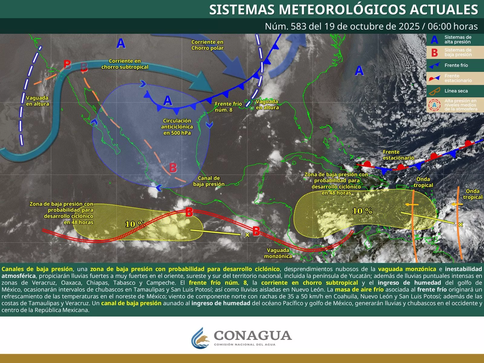 Estos efectos se derivan de una zona de baja presión con potencial para desarrollo ciclónico en el Pacífico sur y la proximidad de la vaguada monzónica, que impulsarán flujo de aire húmedo y cálido hacia el interior del estado; en interacción con ligeros escurrimientos de aire frío por la proximidad del sistema frontal número 8.