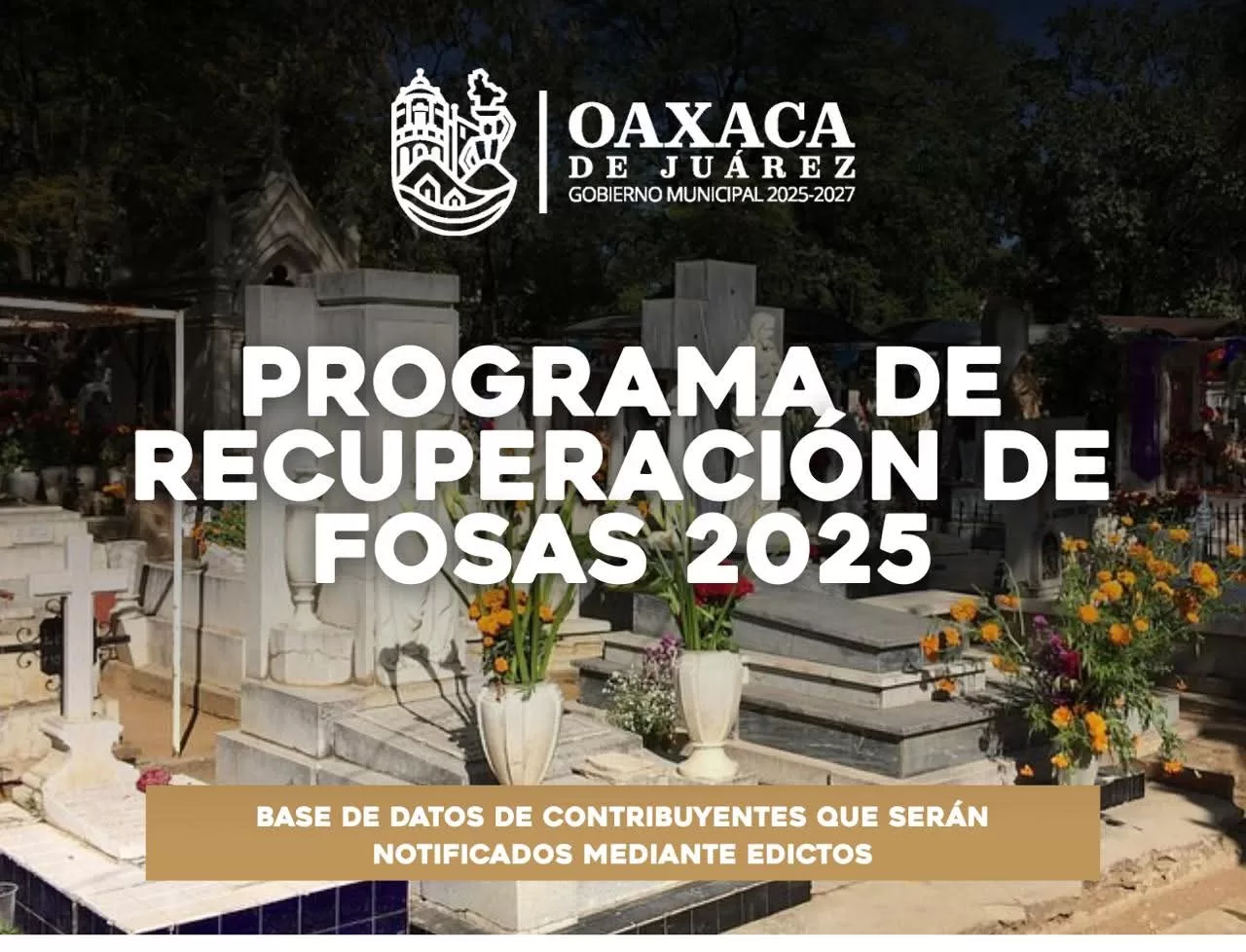Oaxaca de Juárez, Oax., 20 de octubre de 2025.– El Municipio de Oaxaca de Juárez, a través de la Comisión de Servicios Vecinales, Espectáculos y Transparencia, la Secretaría de Servicios Vecinales y la Unidad de Panteones, informa al público en general el inicio del Programa de Recuperación de Fosas 2025, con el objetivo de fomentar la conservación y mantenimiento de los panteones municipales.