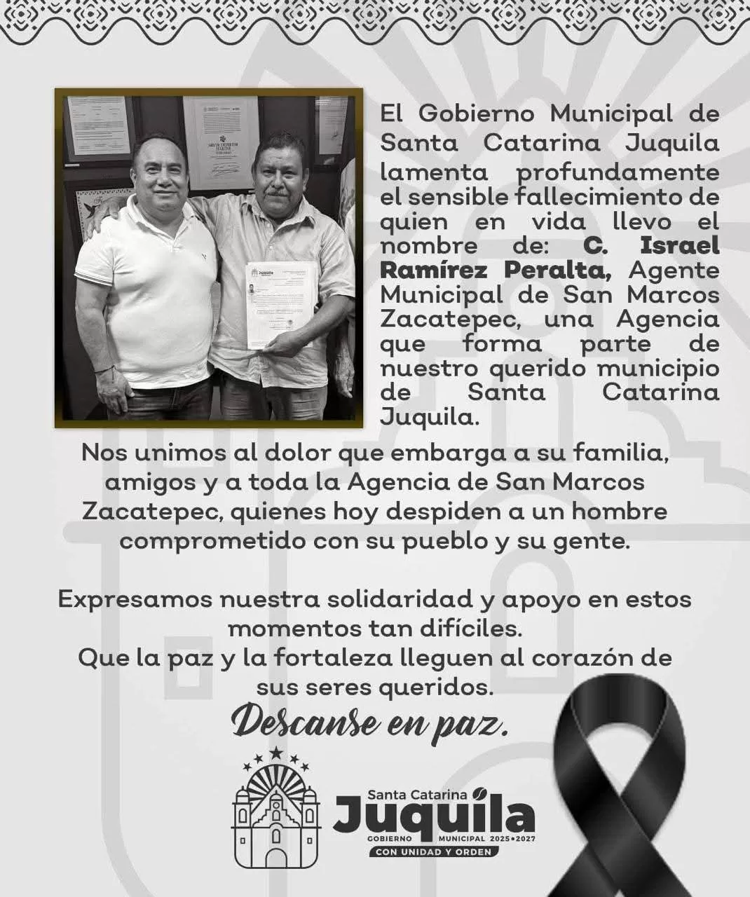 A través de redes sociales, el Ayuntamiento de Santa Catarina Juquila lamentó el fallecimiento del agente municipal y expresó su solidaridad con la familia y habitantes de San Marcos Zacatepec.