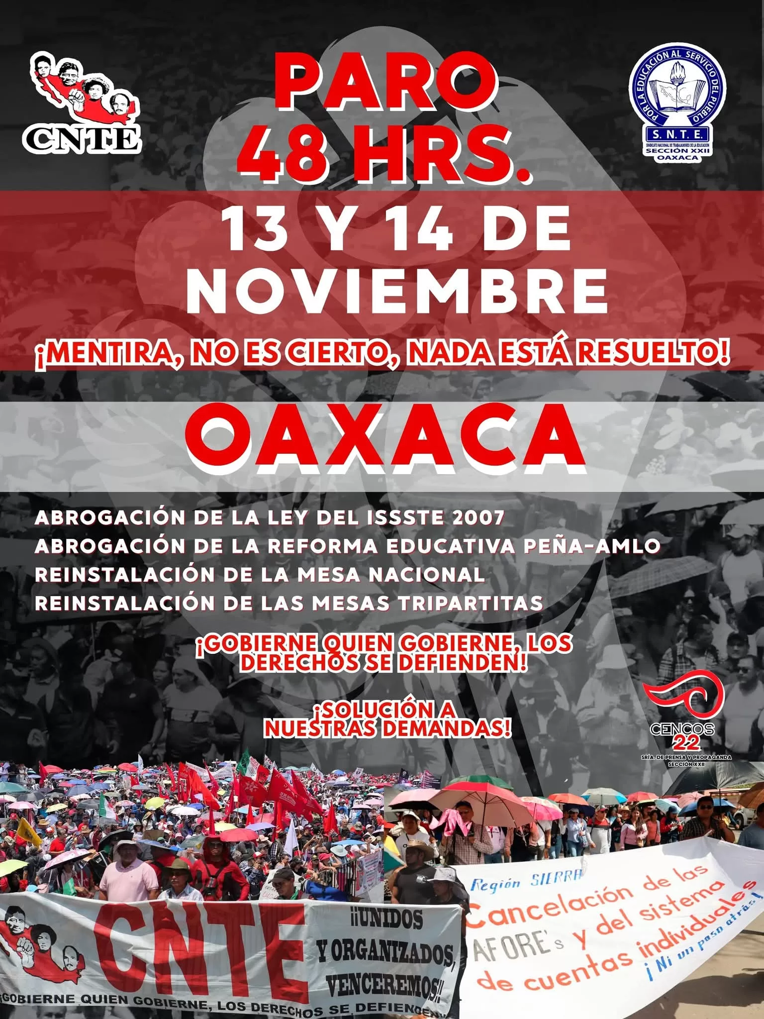 La Sección XXII de la Coordinadora Nacional de Trabajadores de la Educación (CNTE) informó que realizará un paro de labores de 48 horas los días 13 y 14 de noviembre como parte de su Jornada Nacional de Lucha, en cumplimiento a los acuerdos de la Asamblea Nacional Representativa.