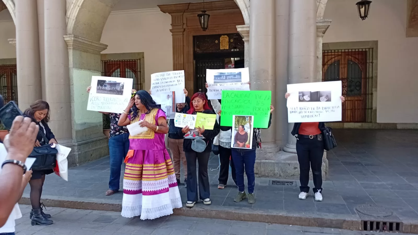 Madres y padres de familia de la Escuela Secundaria “Macedonio Alcalá”, ubicada en la agencia municipal Cruz Blanca de Cuilápam de Guerrero, se manifestaron frente al Palacio de Gobierno para exigir la destitución de la directora del plantel, Violeta Cuadrado Vásquez, a quien acusan de diversas irregularidades dentro de la institución.