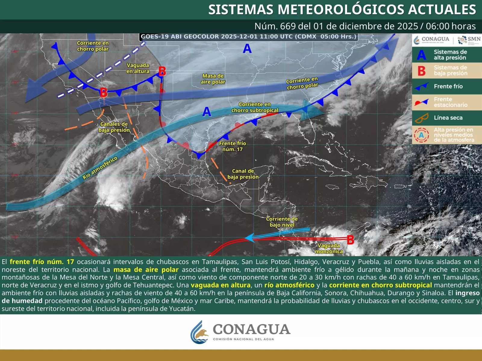 De acuerdo con el pronóstico del tiempo emitido por la Comisión Nacional del Agua (Conagua), el frente frío número 17, de carácter débil, se localiza sobre el oriente de México. Por delante de este sistema, un anticiclón en niveles medios de la atmósfera actúa como bloqueo e impide su avance hacia el sureste.