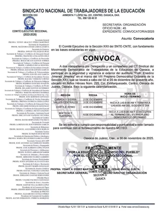 El Comité Ejecutivo de la Sección XXII de la CNTE emitió una convocatoria dirigida a los delegados y representantes sindicales del Movimiento Democrático de Trabajadores de la Educación de Oaxaca (MDTEO), para participar en las labores de seguridad y vigilancia durante el VIII Prepleno Democrático Ordinario