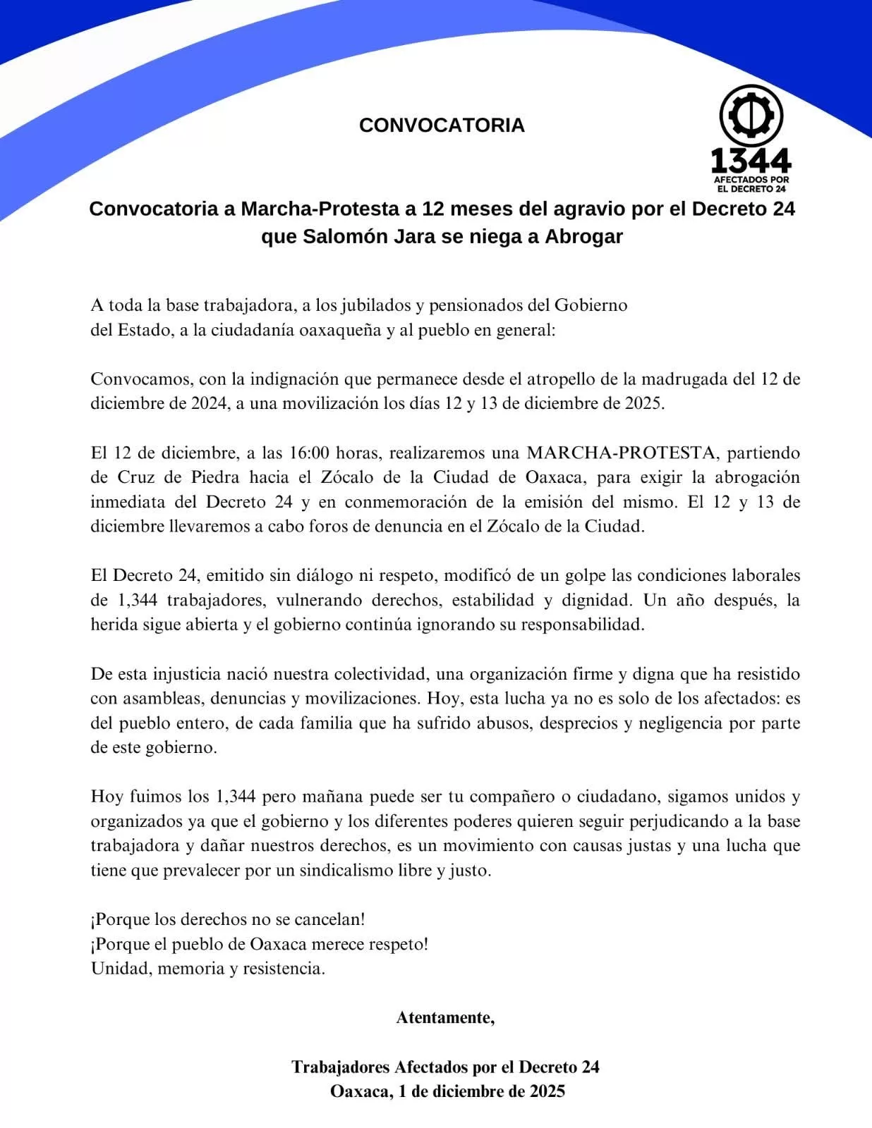 De acuerdo con la convocatoria difundida por las y los Trabajadores Afectados por el Decreto 24, la movilización iniciará el 12 de diciembre a las 16:00 horas, partiendo del Cruz de Piedra hacia el Zócalo de la ciudad de Oaxaca, donde exigirán la abrogación inmediata del decreto y denunciarán lo que consideran afectaciones a la estabilidad y dignidad laboral de 1,344 trabajadores.