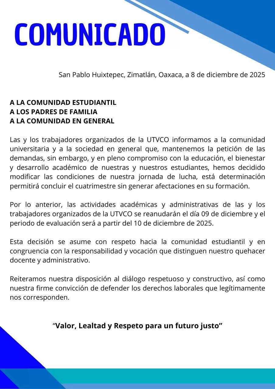 Trabajadoras y trabajadores organizados de la Universidad Tecnológica de los Valles Centrales de Oaxaca (UTVCO) informaron que retomarán sus actividades académicas y administrativas a partir del 9 de diciembre, esto tras ajustar las condiciones de su jornada de lucha con el fin de no afectar la formación del estudiantado.