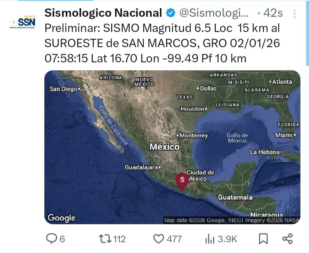 Oaxaca de Juárez, Oax. 2 de enero de 2026.- La Coordinación Estatal de Protección Civil y Gestión de Riesgos (CEPCyGR) informa que la entidad oaxaqueña reporta saldo blanco, sin afectaciones a la población, infraestructura, ni servicios básicos; luego de sismo de magnitud 6.5, registrado a las 7:58 horas, con epicentro al suroeste de San Marcos, Guerrero.