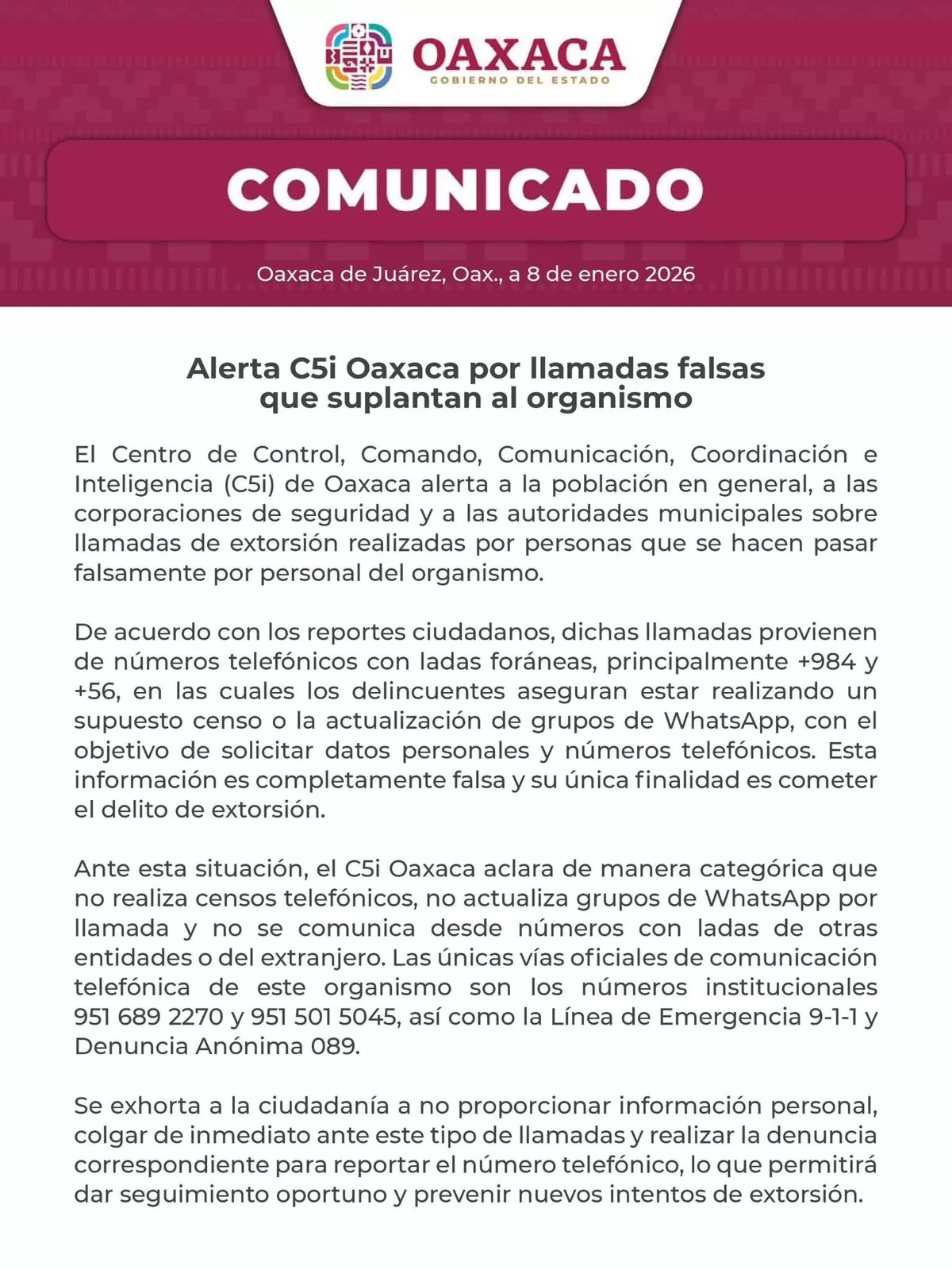 Oaxaca de Juárez, Oax. 8 de enero de 2026.- El Centro de Control, Comando, Comunicación, Coordinación e Inteligencia (C5i) de Oaxaca alerta a la población en general, a las corporaciones de seguridad y a las autoridades municipales sobre llamadas de extorsión realizadas por personas que se hacen pasar falsamente por personal del organismo.