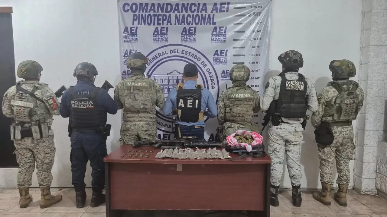 Oaxaca de Juárez a 09 de enero de 2026.- La Fiscalía General del Estado de Oaxaca (FGEO), en estrecha coordinación con la Secretaría de Marina (SEMAR) y con el apoyo de la Policía Municipal de Santiago Pinotepa Nacional, logró el aseguramiento de un arma de fuego de uso exclusivo del Ejército, así como drogas, durante un operativo interinstitucional realizado en la región Costa.